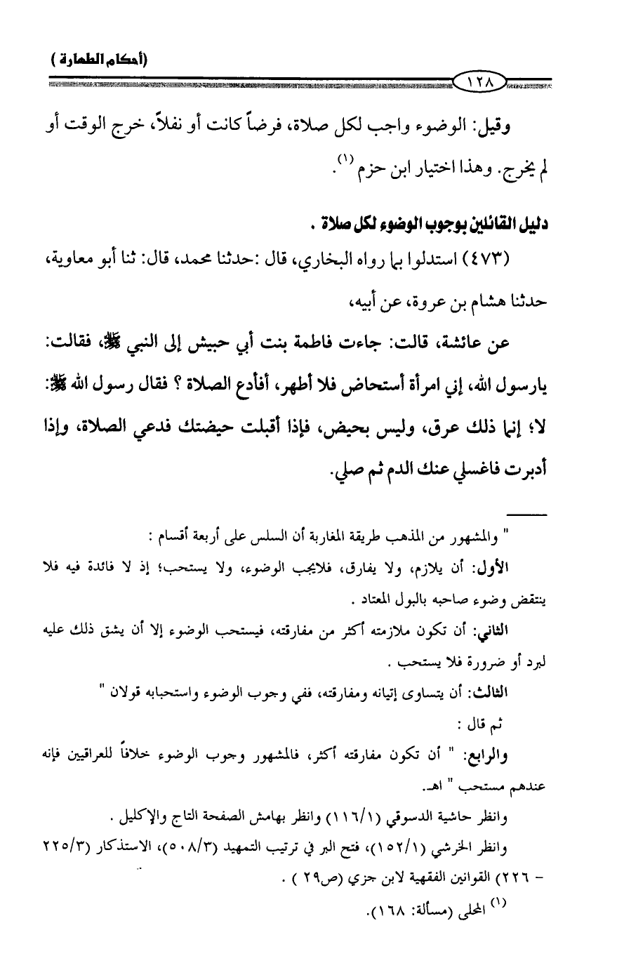 وانظر الخرشي (1/ 152)، فتح البر في ترتيب التمهيد (3/ 508)، الاستذكار (3/ 225 - 226) القوانين الفقهية لابن جزي (ص 29).