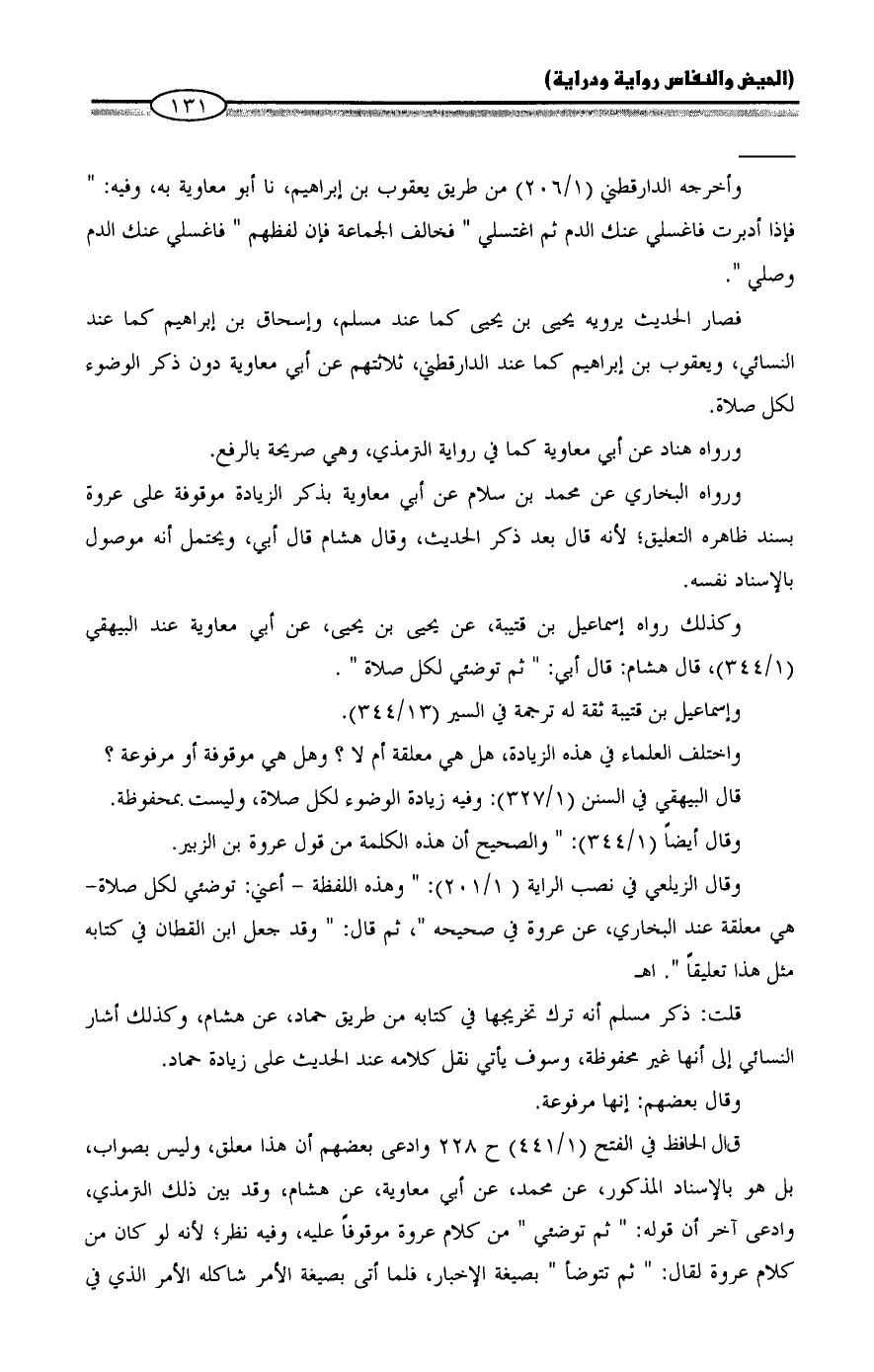 فصار الحديث يرويه يحيى بن يحيى كما عند مسلم، وإسحاق بن إبراهيم كما عند النسائي، ويعقوب بن إبراهيم كما عند الدارقطني، ثلاثتهم عن أبي معاوية دون ذكر الوضوء لكل صلاة.