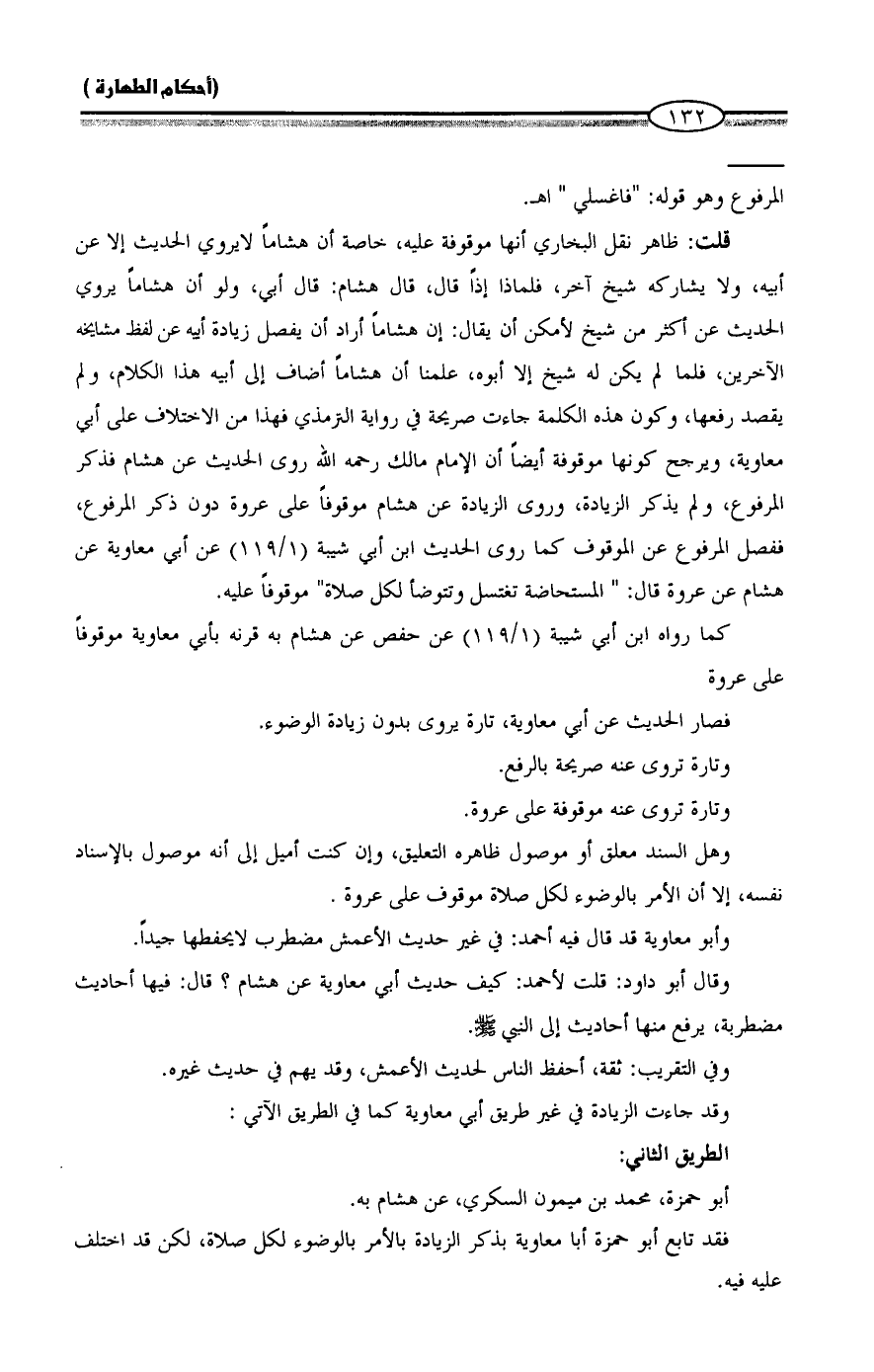 قلت: ظاهر نقل البخاري أنها موقوفة عليه، خاصة أن هشاماً لا يروي الحديث إلا عن أبيه، ولا يشاركه شيخ آخر، فلماذا إذاً قال، قال هشام: قال أبي، ولو أن هشاماً يروي الحديث عن أكثر من شيخ لأمكن أن يقال: إن هشاماً أراد أن يفصل زيادة أبيه عن لفظ مشايخه الآخرين، فلما لم يكن له شيخ إلا أبوه، علمنا أن هشاماً أضاف إلى أبيه هذا الكلام، ولم يقصد رفعها، وكون هذه الكلمة جاءت صريحة في رواية الترمذي فهذا من الاختلاف على أبي معاوية، ويرجح كونها موقوفة أيضاً أن الإمام مالك رحمه الله روى الحديث عن هشام فذكر المرفوع، ولم يذكر الزيادة، وروى الزيادة عن هشام موقوفاً على عروة دون ذكر المرفوع، ففصل المرفوع عن الموقوف كما روى الحديث ابن أبي شيبة (1/ 119) عن أبي معاوية عن هشام عن عروة قال: "المستحاضة تغتسل وتتوضأ لكل صلاة" موقوفاً عليه.