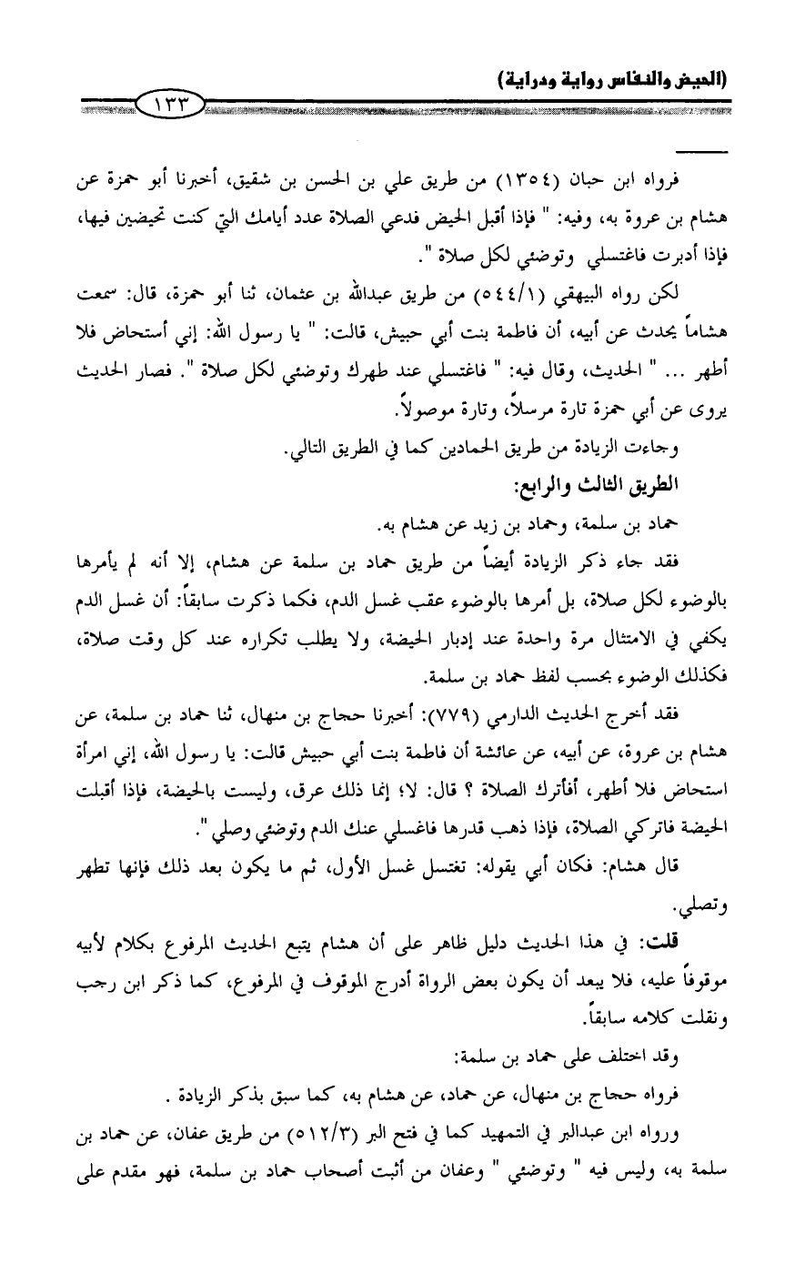 ورواه ابن عبد البر في التمهيد كما في فتح البر (3/ 512) من طريق عفان، عن حماد بن سلمة به، وليس فيه "وتوضئي" وعفان من أثبت أصحاب حماد بن سلمة، فهو مقدم على