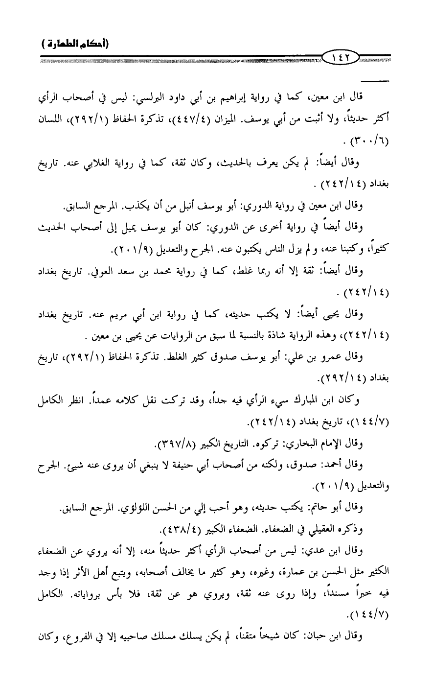 قال ابن معين، كما في رواية إبراهيم بن أبي داود البرلسي: ليس في أصحاب الرأي أكثر حديثاً، ولا أثبت من أبي يوسف. الميزان (4/ 447)، تذكرة الحفاظ (1/ 292)، اللسان (6/ 300).