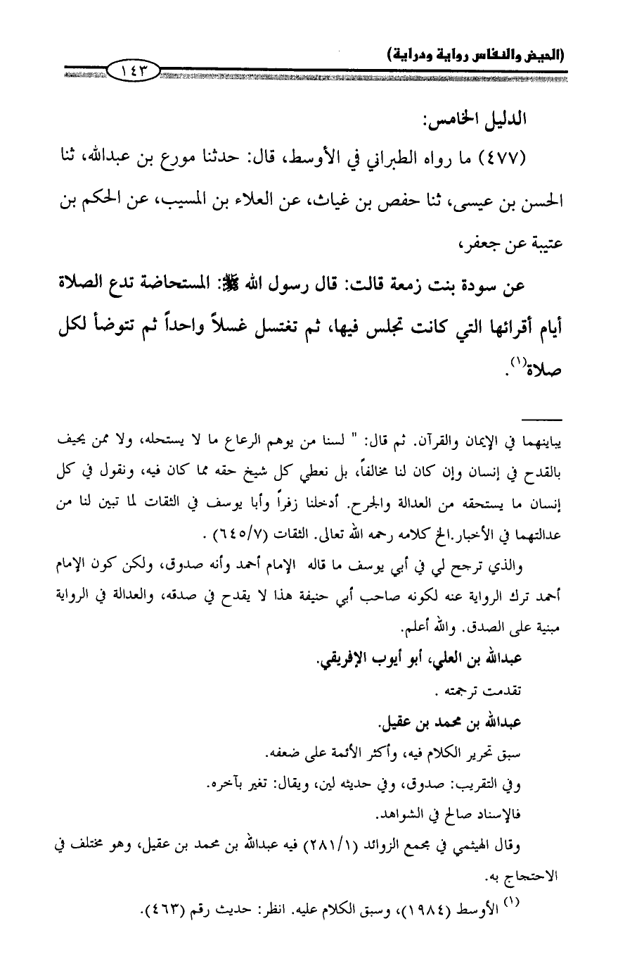 (477) ما رواه الطبراني في الأوسط، قال: حدثنا مورع بن عبد الله، ثنا الحسن بن عيسى، ثنا حفص بن غياث، عن العلاء بن المسيب، عن الحكم بن عتيبة عن جعفر،