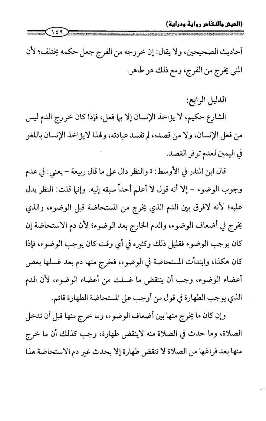 قال ابن المنذر في الأوسط: "والنظر دال على ما قال ربيعة - يعني: في عدم وجوب الوضوء - إلا أنه قول لا أعلم أحداً سبقه إليه. وإنما قلت: النظر يدل عليه؛ لأنه لا فرق بين الدم الذي يخرج من المستحاضة قبل الوضوء، والذي يخرج في أضعاف الوضوء، والدم الخارج بعد الوضوء؛ لأن دم الاستحاضة إن كان يوجب الوضوء فقليل ذلك وكثيره في أي وقت كان يوجب الوضوء، فإذا كان هكذا، وابتدأت المستحاضة في الوضوء، فخرج منها دم بعد غسلها بعض أعضاء الوضوء، وجب أن ينتقض ما غسلت من أعضاء الوضوء، لأن الدم الذي يوجب الطهارة في قول من أوجب على المستحاضة الطهارة قائم.
