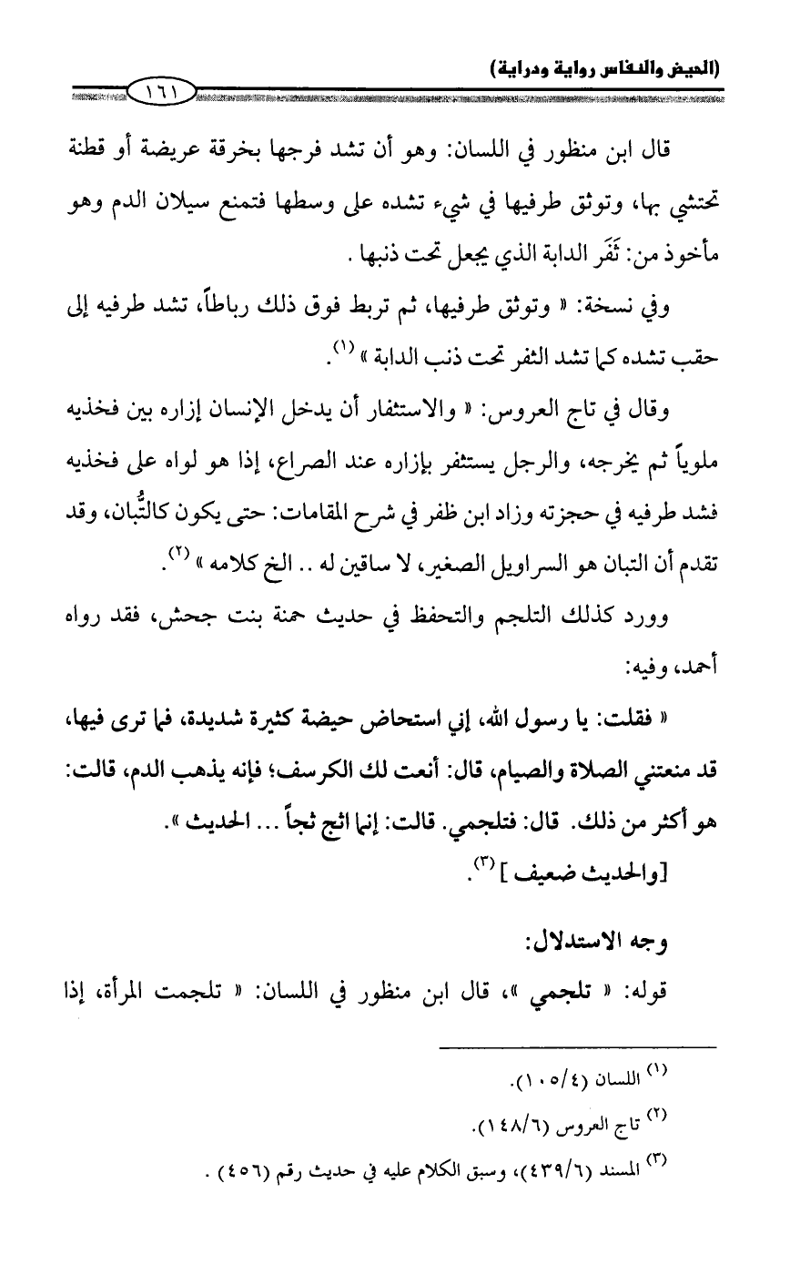 وورد كذلك التلجم والتحفظ في حديث حمنة بنت جحش، فقد رواه أحمد، وفيه: