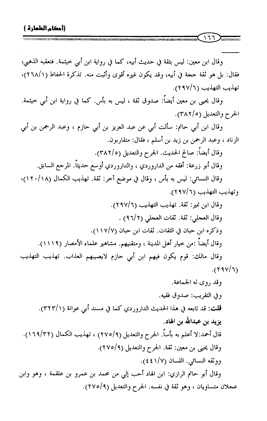 وقال أبو حاتم الرازي: ابن الهاد أحب إلي من محمد بن عمرو بن علقمة، وهو وابن عجلان متساويان، وهو ثقة في نفسه. الجرح والتعديل (9/ 275).