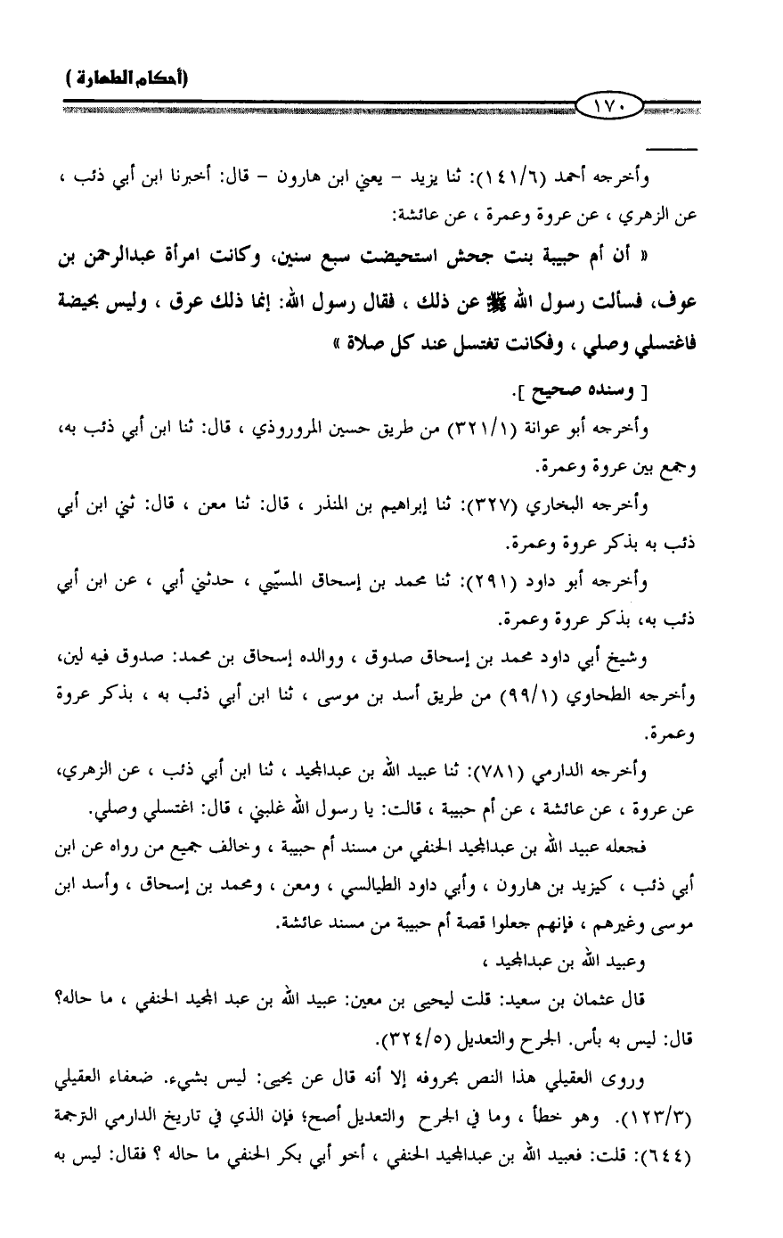 وأخرجه الدارمي (781): ثنا عبيد الله بن عبد المجيد، ثنا ابن أبي ذئب، عن الزهري، عن عروة، عن عائشة، عن أم حبيبة، قالت: يا رسول الله غلبني، قال: اغتسلي وصلي.