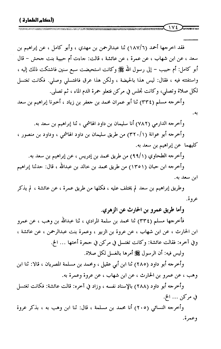 فقد أخرجها أحمد (6/ 187) ثنا عبد الرحمن بن مهدي، وأبو كامل، عن إبراهيم بن سعد، عن ابن شهاب، عن عمرة، عن عائشة، قالت: جاءت أم حبيبة بنت جحش - قال أبو كامل: أم حبيب - إلى رسول الله - صلى الله عليه وسلم - وكانت استحيضت سبع سنين فاشتكت ذلك إليه، واستفتته فيه، فقال: ليس هذا بالحيضة، ولكن هذا عرق فاغتسلي وصلي. فكانت تغتسل لكل صلاة وتصلي، وكانت تجلس في مركن فتعلو حمرة الدم الماء، ثم تصلي.