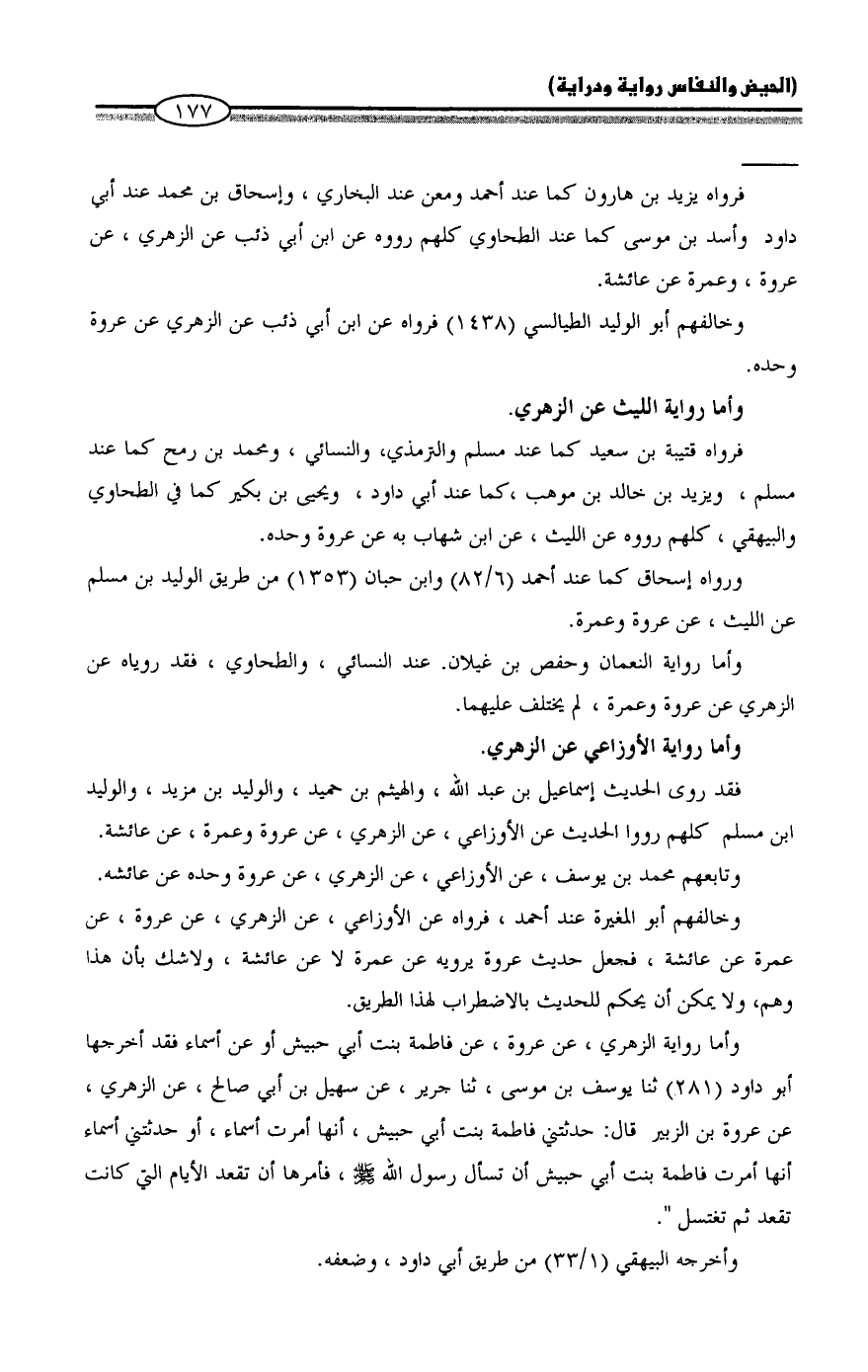 وأما رواية الزهري، عن عروة، عن فاطمة بنت أبي حبيش أو عن أسماء فقد أخرجها أبو داود (281) ثنا يوسف بن موسى، ثنا جرير، عن سهيل بن أبي صالح، عن الزهري، عن عروة بن الزبير قال: حدثتني فاطمة بنت أبي حبيش، أنها أمرت أسماء، أو حدثتني أسماء أنها أمرت فاطمة بنت أبي حبيش أن تسأل رسول الله - صلى الله عليه وسلم -، فأمرها أن تقعد الأيام التي كانت تقعد ثم تغتسل".