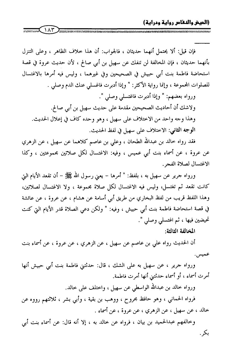 فإن قيل: ألا يحتمل أنهما حديثان، فالجواب: أن هذا خلاف الظاهر، وعلى التنزل بأنهما حديثان، فإن المخالفة لن تنفك عن سهيل بن أبي صالح، لأن حديث عروة في قصة استحاضة فاطمة بنت أبي حبيش في الصحيحين وفي غيرهما، وليس فيه أمرها بالاغتسال للصلوات المجموعة، وإنما رواية الأكثر: "وإذا أدبرت فاغسلي عنك الدم وصلي.