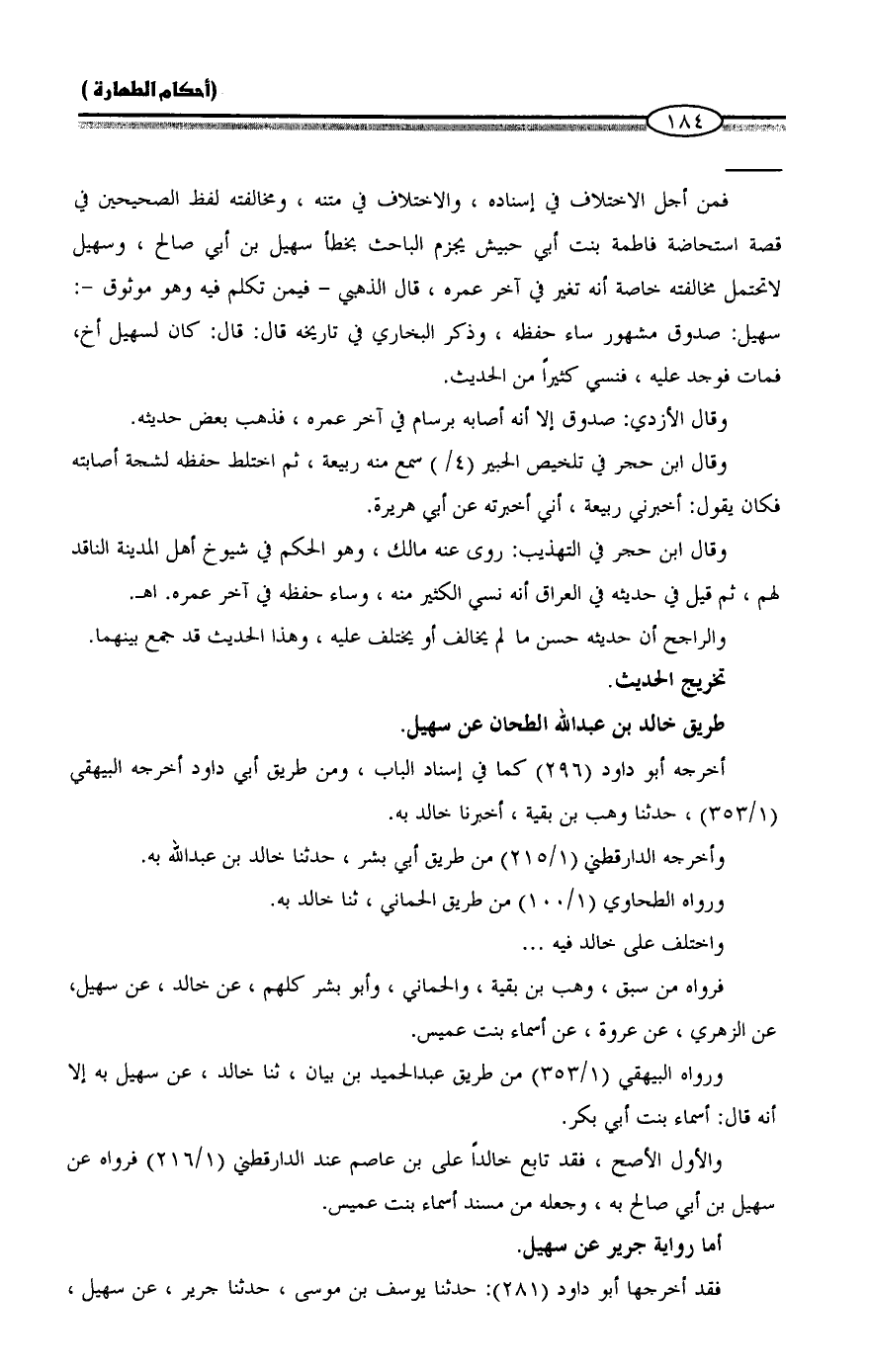 فمن أجل الاختلاف في إسناده، والاختلاف في متنه، ومخالفته لفظ الصحيحين في قصة استحاضة فاطمة بنت أبي حبيش يجزم الباحث بخطأ سهيل بن أبي صالح، وسهيل لا تحتمل مخالفته خاصة أنه تغير في آخر عمره، قال الذهبي - فيمن تكلم فيه وهو موثوق -: سهيل: صدوق مشهور ساء حفظه، وذكر البخاري في تاريخه قال: قال: كان لسهيل أخ، فمات فوجد عليه، فنسي كثيراً من الحديث.