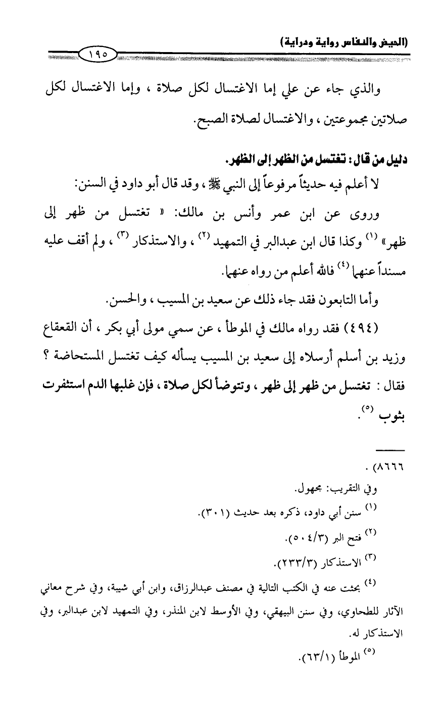 (494) فقد رواه مالك في الموطأ، عن سمي مولى أبي بكر، أن القعقاع وزيد بن أسلم أرسلاه إلى سعيد بن المسيب يسأله كيف تغتسل المستحاضة؟ فقال: تغتسل من ظهر إلى ظهر، وتتوضأ لكل صلاة، فإن غلبها الدم استثفرت بثوب (¬5).