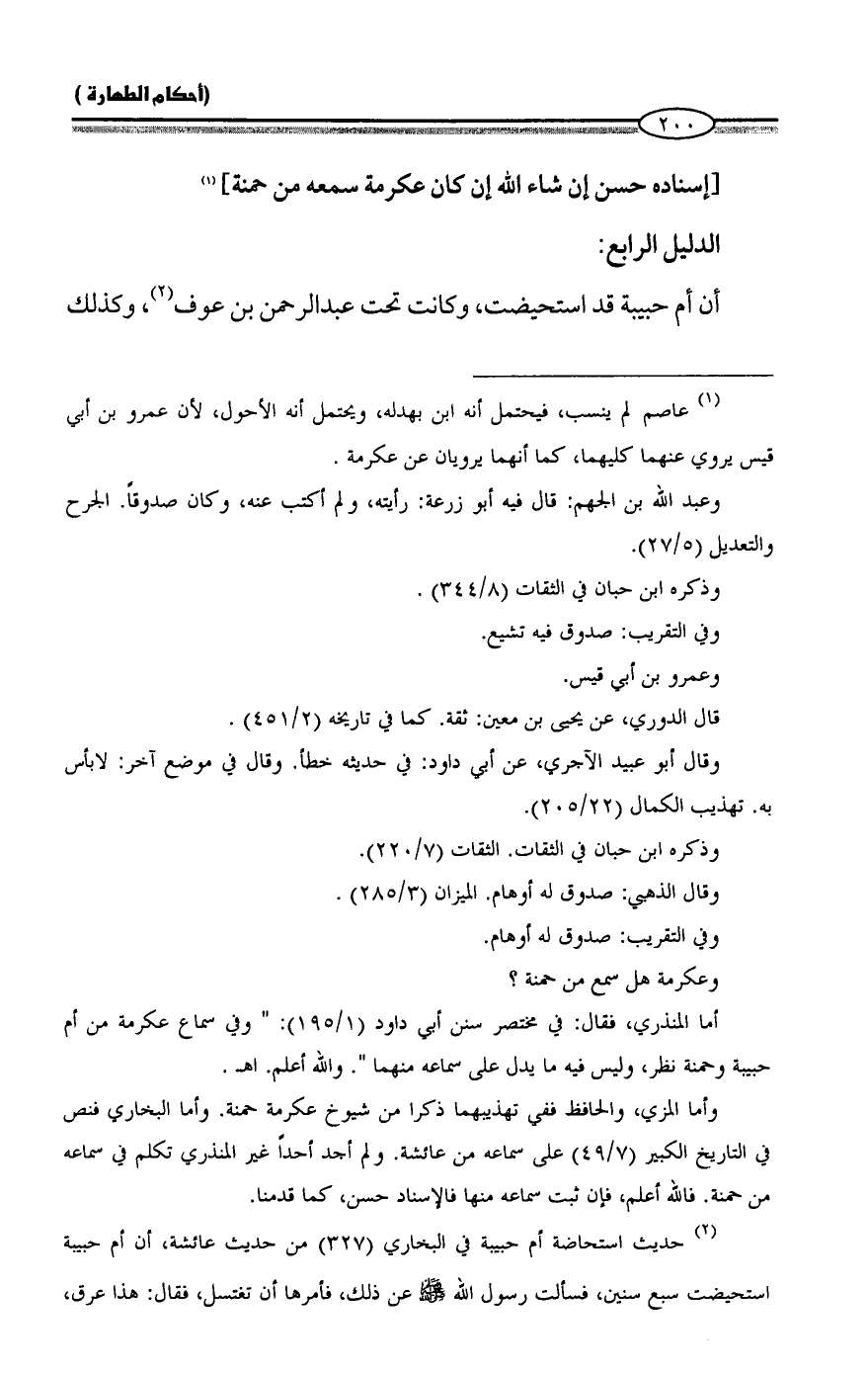 أما المنذري، فقال: في مختصر سنن أبي داود (1/ 195): "وفي سماع عكرمة من أم حبيبة وحمنة نظر، وليس فيه ما يدل على سماعه منهما". والله أعلم. اهـ.