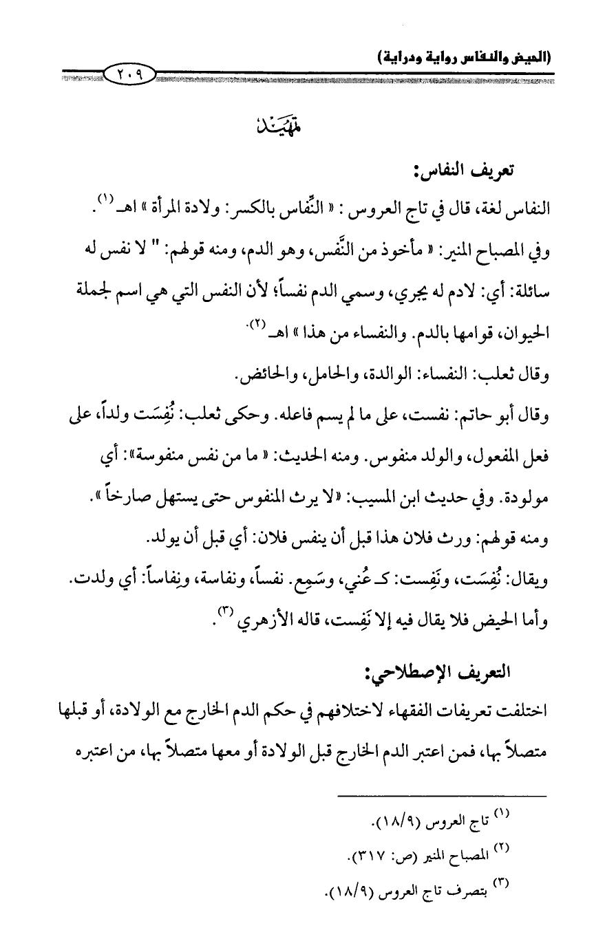 وفي المصباح المنير: "مأخوذ من النَّفس، وهو الدم، ومنه قولهم: "لا نفس له سائلة: أي: لا دم له يجري، وسمي الدم نفساً؛ لأن النفس التي هي اسم لجملة الحيوان، قوامها بالدم. والنفساء من هذا" اهـ (¬2).