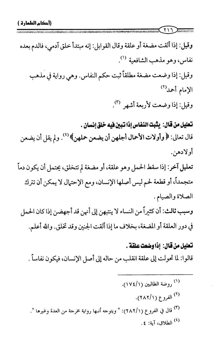 تعليل آخر: إذا سقط الحمل وهو علقة، أو مضغة لم تتخلق، يحتمل أن يكون دماً متجمداً، أو قطعة لحم ليس أصلها الإنسان، ومع الإحتمال لا يمكن أن تترك الصلاة والصيام.