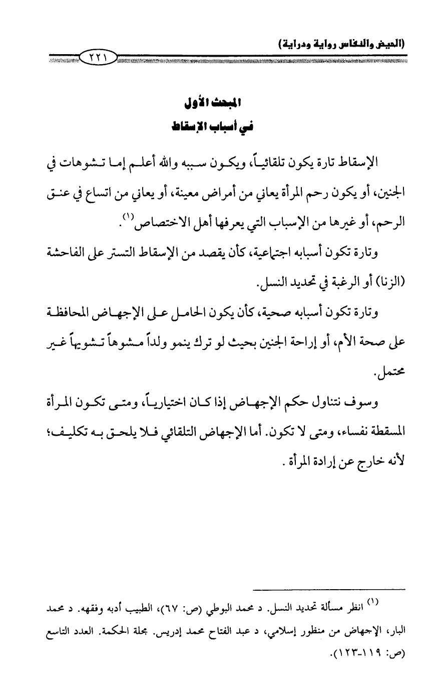 (¬1) انظر مسألة تحديد النسل. د محمد البوطي (ص: 67)، الطبيب أدبه وفقهه. د محمد البار، الإجهاض من منظور إسلامي، د عبد الفتاح محمد إدريس. مجلة الحكمة. العدد التاسع (ص: 119 - 123).