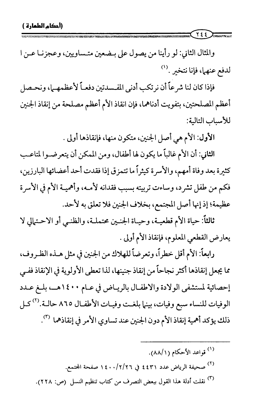 رابعاً: الأم أقل خطراً، وتعرضاً للهلاك من الجنين في مثل هذه الظروف، مما يجعل إنقاذها أكثر نجاحاً من إنقاذ جنينها, لذا تعطى الأولوية في الإنقاذ ففي إحصائية لمستشفى الولادة والاطفال بالرياض في عام 1400 هـ، بلغ عدد الوفيات للنساء سبع وفيات، بينما بلغت وفيات الأطفال 865 حالة. (¬2) كل ذلك يؤكد أهمية إنقاذ الأم دون الجنين عند تساوي الأمر في إنقاذهما (¬3).