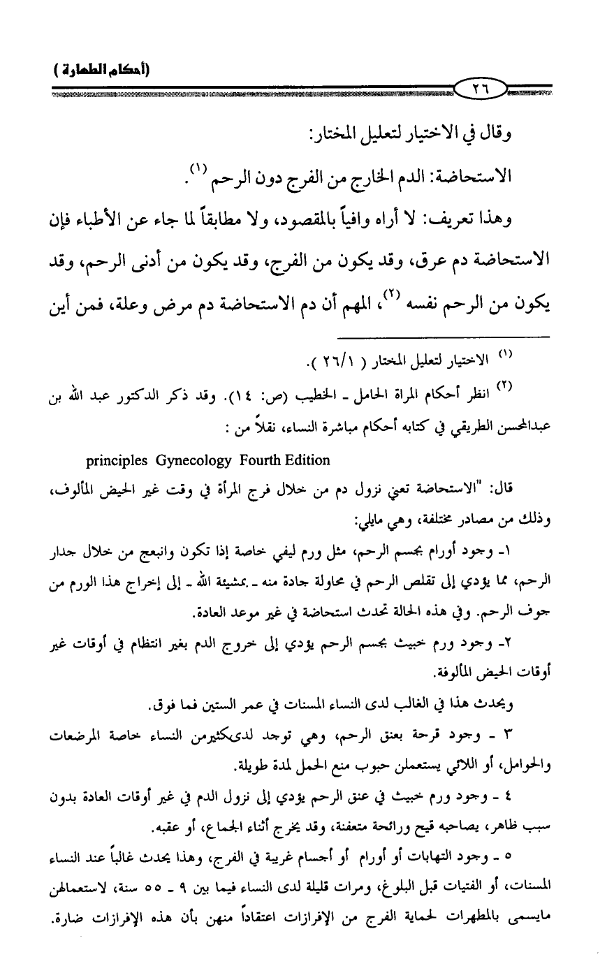قال: "الاستحاضة تعني نزول دم من خلال فرج المرأة في وقت غير الحيض المألوف، وذلك من مصادر مختلفة، وهي ما يلي: