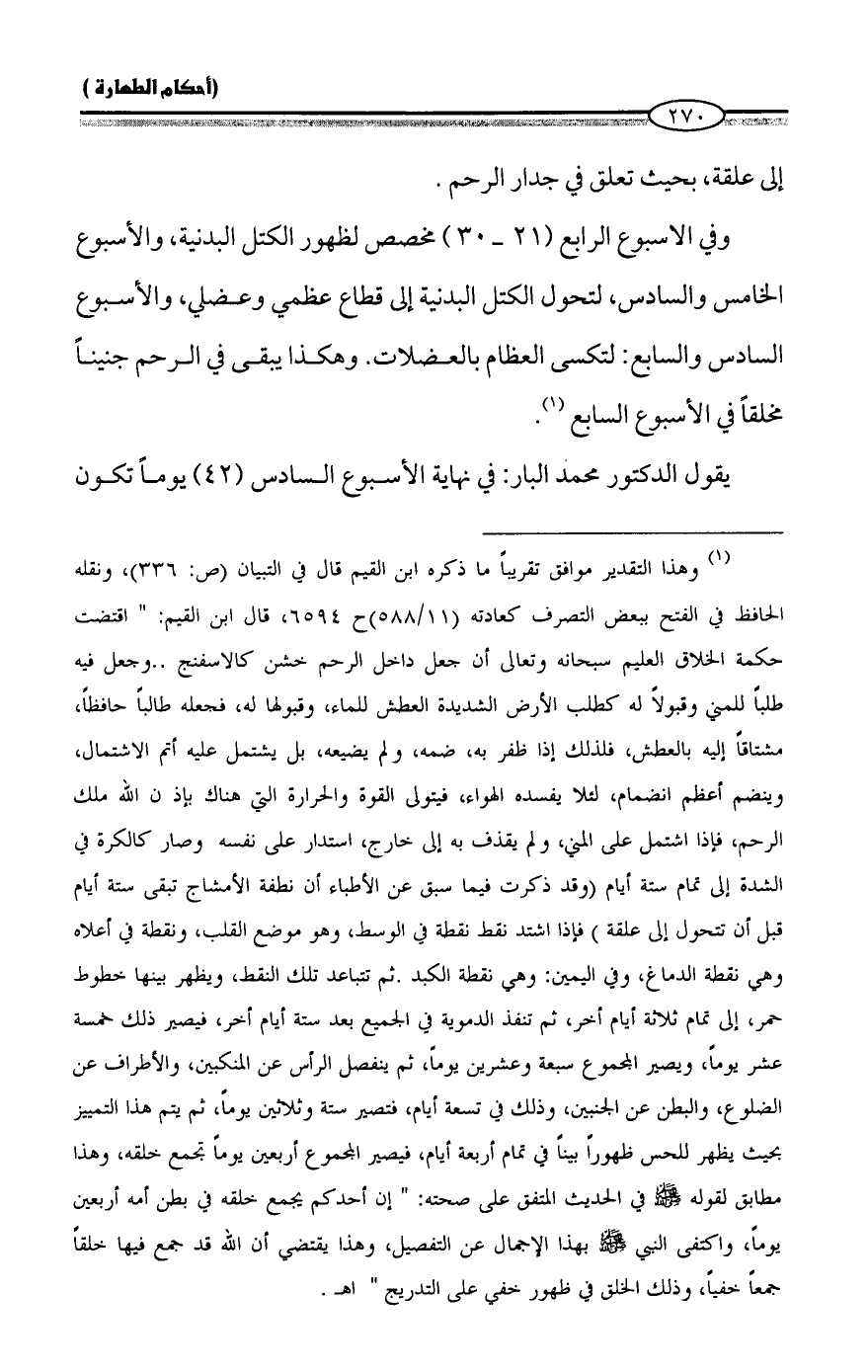 (¬1) وهذا التقدير موافق تقريباً ما ذكره ابن القيم قال في التبيان (ص: 336)، ونقله الحافظ في الفتح ببعض التصرف كعادته (11/ 588) ح 6594، قال ابن القيم: "اقتضت حكمة الخلاق العليم سبحانه وتعالى أن جعل داخل الرحم خشن كالاسفنج .. وجعل فيه طلباً للمني وقبولاً له كطلب الأرض الشديدة العطش للماء، وقبولها له، فجعله طالباً حافظاً، مشتاقاً إليه بالعطش، فلذلك إذا ظفر به، ضمه، ولم يضيعه، بل يشتمل عليه أتم الاشتمال، وينضم أعظم انضمام، لئلا يفسده الهواء، فيتولى القوة والحرارة التي هناك بإذن الله ملك الرحم، فإذا اشتمل على المني، ولم يقذف به إلى خارج، استدار على نفسه وصار كالكرة في الشدة إلى تمام ستة أيام (وقد ذكرت فيما سبق عن الأطباء أن نطفة الأمشاج تبقى ستة أيام قبل أن تتحول إلى علقة) فإذا اشتد نقط نقطة في الوسط، وهو موضع القلب، ونقطة في أعلاه وهي نقطة الدماغ، وفي اليمين: وهي نقطة الكبد. ثم تتباعد تلك النقط، ويظهر بينها خطوط حمر، إلى تمام ثلاثة أيام أخر، ثم تنفذ الدموية في الجميع بعد ستة أيام أخر، فيصير ذلك خمسة عشر يوماً، ويصير المجموع سبعة وعشرين يوماً، ثم ينفصل الرأس عن المنكبين، والأطراف عن الضلوع، والبطن عن الجنبين، وذلك في تسعة أيام، فتصير ستة وثلاثين يوماً، ثم يتم هذا التمييز بحيث يظهر للحس ظهوراً بيناً في تمام أربعة أيام، فيصير المجموع أربعين يوماً تجمع خلقه، وهذا مطابق لقوله - صلى الله عليه وسلم - الحديث المتفق على صحته: "إن أحدكم يجمع خلقه في بطن أمه أربعين يوماً، واكتفى النبي - صلى الله عليه وسلم - بهذا الإجمال عن التفصيل، وهذا يقتضي أن الله قد جمع فيها خلقاً جمعاً خفياً، وذلك الخلق في ظهور خفي على التدريج" اهـ.