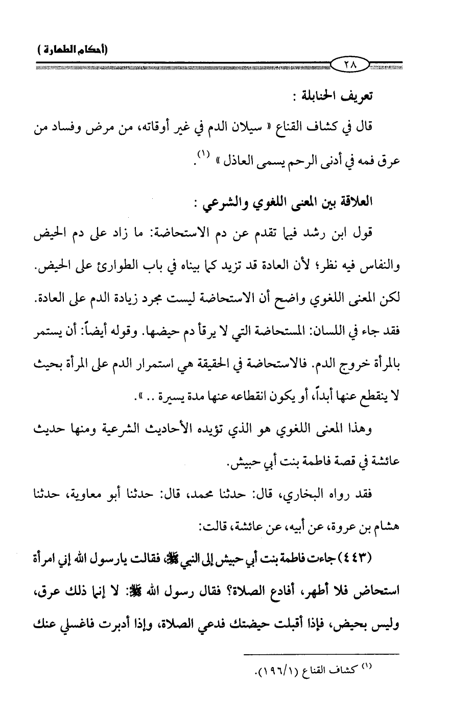 (443) جاءت فاطمة بنت أبي حبيش إلى النبي - صلى الله عليه وسلم -، فقالت يا رسول الله إني امرأة استحاض فلا أطهر، أفادع الصلاة؟ فقال رسول الله - صلى الله عليه وسلم -: لا إنما ذلك عرق، وليس بحيض، فإذا أقبلت حيضتك فدعي الصلاة، وإذا أدبرت فاغسلي عنك