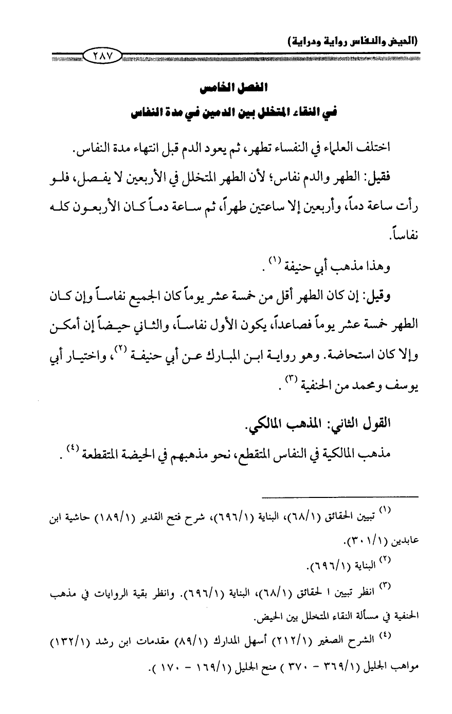 (¬3) انظر تبيين الحقائق (1/ 68)، البناية (1/ 696). وانظر بقية الروايات في مذهب الحنفية في مسألة النقاء المتخلل بين الحيض.