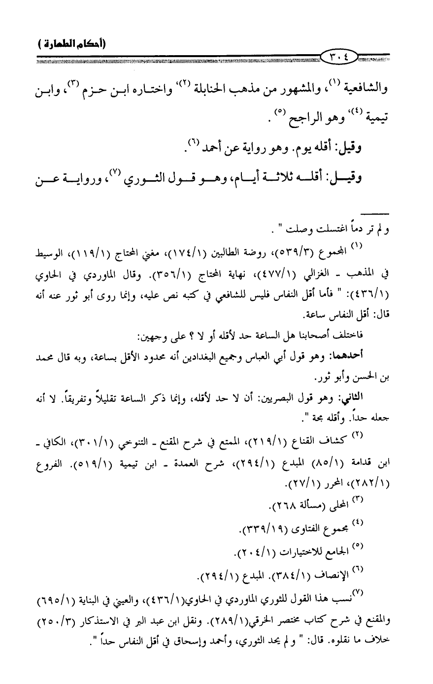 (¬1) المجموع (3/ 539)، روضة الطالبين (1/ 174)، مغني المحتاج (1/ 119)، الوسيط في المذهب - الغزالي (1/ 477)، نهاية المحتاج (1/ 356). وقال الماوردي في الحاوي (1/ 436): "فأما أقل النفاس فليس للشافعي في كتبه نص عليه، وإنما روى أبو ثور عنه أنه قال: أقل النفاس ساعة.