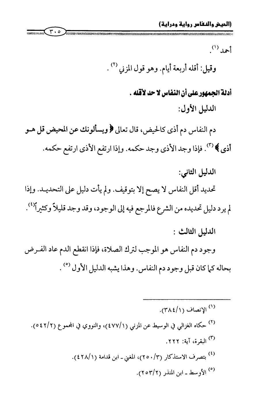 تحديد أقل النفاس لا يصح إلا بتوقيف. ولم يأت دليل على التحديد. وإذا لم يرد دليل تحديده من الشرع فالمرجع فيه إلى الوجود، وقد وجد قليلاً وكثيراً (¬4).