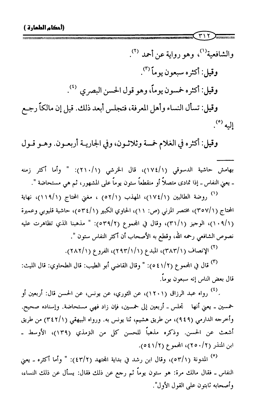 (¬5) المدونة (1/ 53)، وقال ابن رشد في بداية المجتهد (2/ 43): "وأما أكثره - يعني النفاس - فقال مالك مرة: هو ستون يوماً ثم رجع عن ذلك فقال: يسأل عن ذلك النساء، وأصحابه ثابتون على القول الأول".