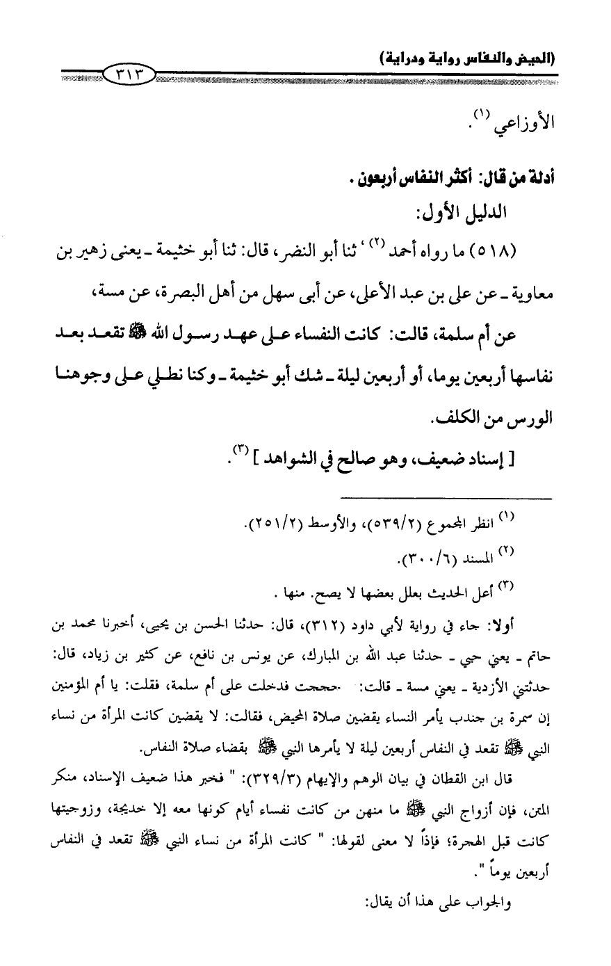 عن أم سلمة، قالت: كانت النفساء على عهد رسول الله - صلى الله عليه وسلم - تقعد بعد نفاسها أربعين يوماً، أو أربعين ليلة - شك أبو خثيمة - وكنا نطلي على وجوهنا الورس من الكلف.