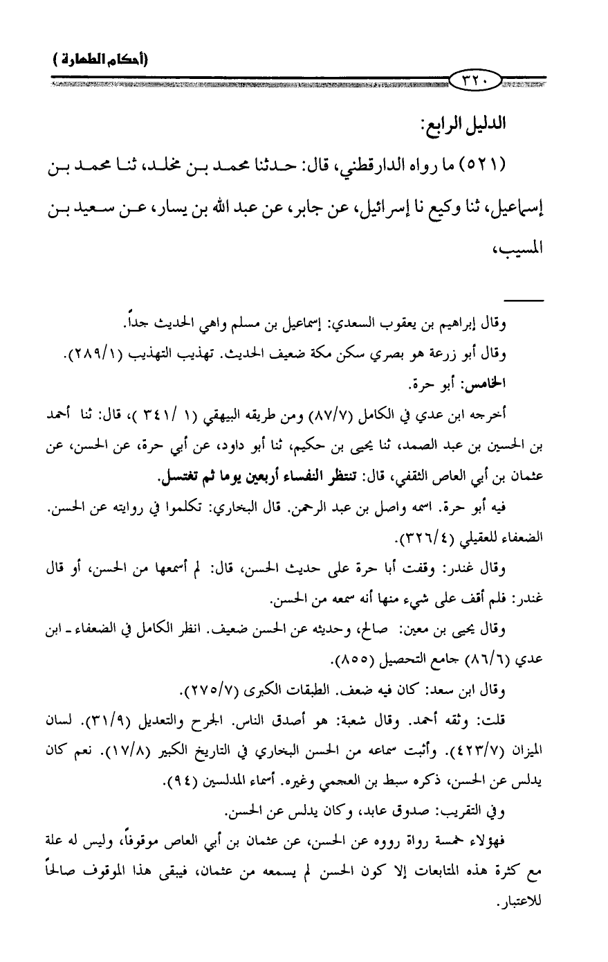 (521) ما رواه الدارقطني، قال: حدثنا محمد بن مخلد، ثنا محمد بن إسماعيل، ثنا وكيع نا إسرائيل، عن جابر، عن عبد الله بن يسار، عن سعيد بن المسيب،
