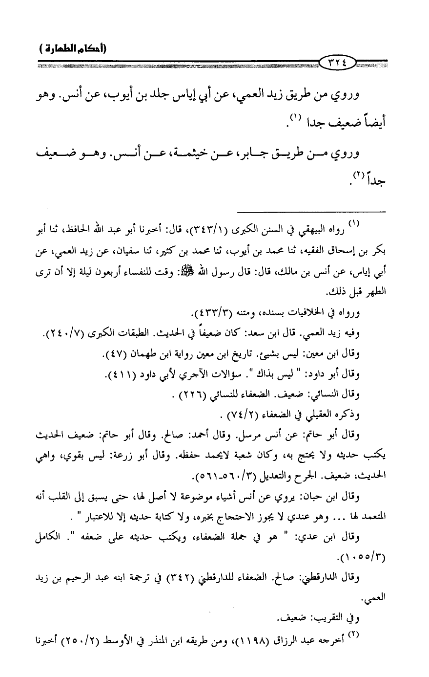 (¬1) رواه البيهقي في السنن الكبرى (1/ 343)، قال: أخبرنا أبو عبد الله الحافظ، ثنا أبو بكر بن إسحاق الفقيه، ثنا محمد بن أيوب، ثنا محمد بن كثير، ثنا سفيان، عن زيد العمي، عن أبي إياس، عن أنس بن مالك، قال: قال رسول الله - صلى الله عليه وسلم -: وقت للنفساء أربعون ليلة إلا أن ترى الطهر قبل ذلك.