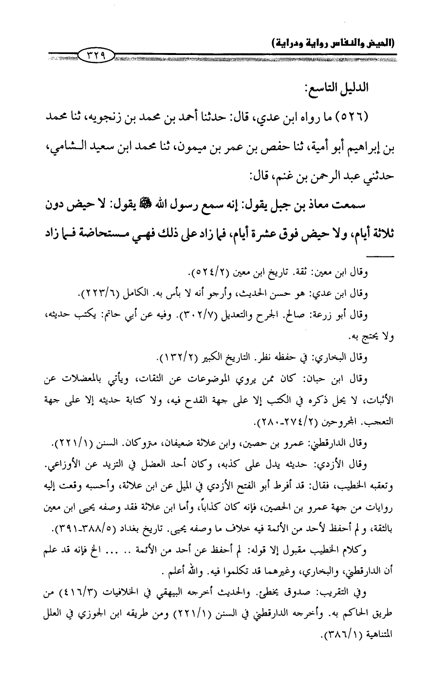 سمعت معاذ بن جبل يقول: إنه سمع رسول الله - صلى الله عليه وسلم - يقول: لا حيض دون ثلاثة أيام، ولا حيض فوق عشرة أيام، فما زاد على ذلك فهي مستحاضة فما زاد