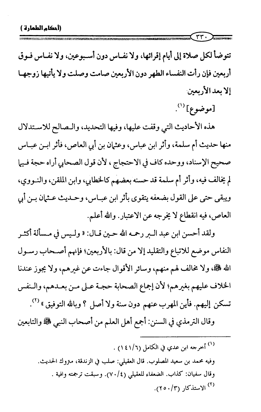 ولقد أحسن ابن عبد البر رحمه الله حين قال: "وليس في مسألة أكثر النفاس موضع للاتباع والتقليد إلا من قال: بالأربعين؛ فإنهم أصحاب رسول الله - صلى الله عليه وسلم -، ولا مخالف لهم منهم، وسائر الأقوال جاءت عن غيرهم، ولا يجوز عندنا الخلاف عليهم بغيرهم؛ لأن إجماع الصحابة حجة على من بعدهم، والنفس تسكن إليهم. فأين المهرب عنهم دون سنة ولا أصل؟ وبالله التوفيق" (¬2).