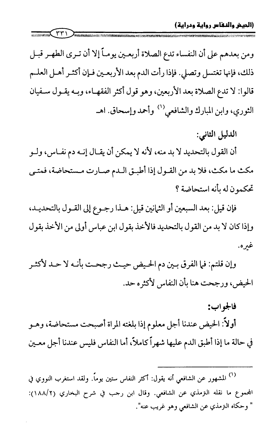 (¬1) المشهور عن الشافعي أنه يقول: أكثر النفاس ستين يوماً. ولقد استغرب النووي في المجموع ما نقله الترمذي عن الشافعي. وقال ابن رجب في شرح البخاري (2/ 188): "وحكاه الترمذي عن الشافعي وهو غريب عنه".