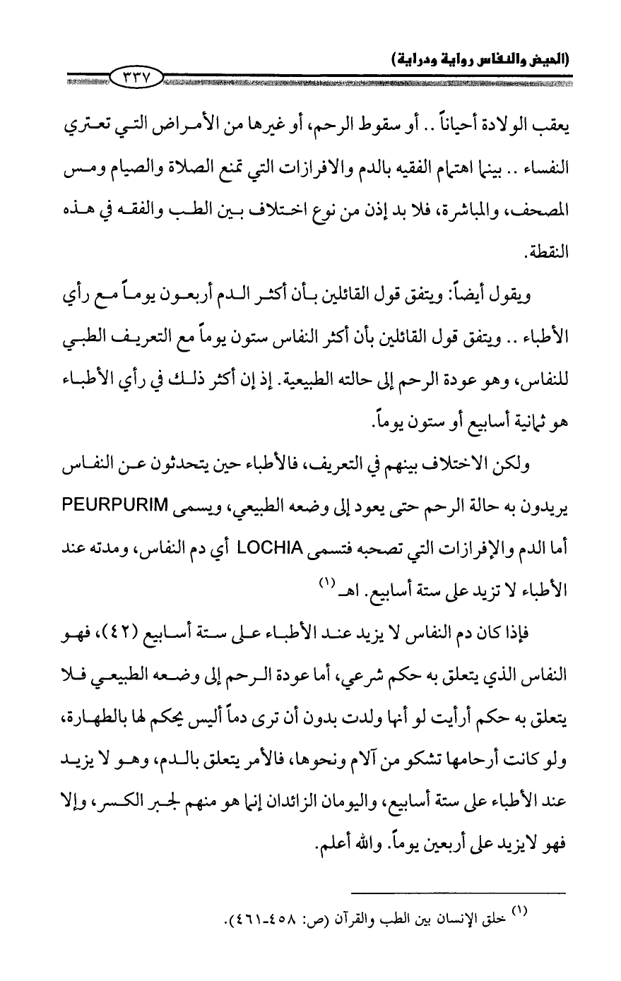ولكن الاختلاف بينهم في التعريف، فالأطباء حين يتحدثون عن النفاس يريدون به حالة الرحم حتى يعود إلى وضعه الطبيعي، ويسمى PEURPURIM أما الدم والإفرازات التي تصحبه فتسمى LOCHIA أي دم النفاس، ومدته عند الأطباء لا تزيد على ستة أسابيع. اهـ (¬1)