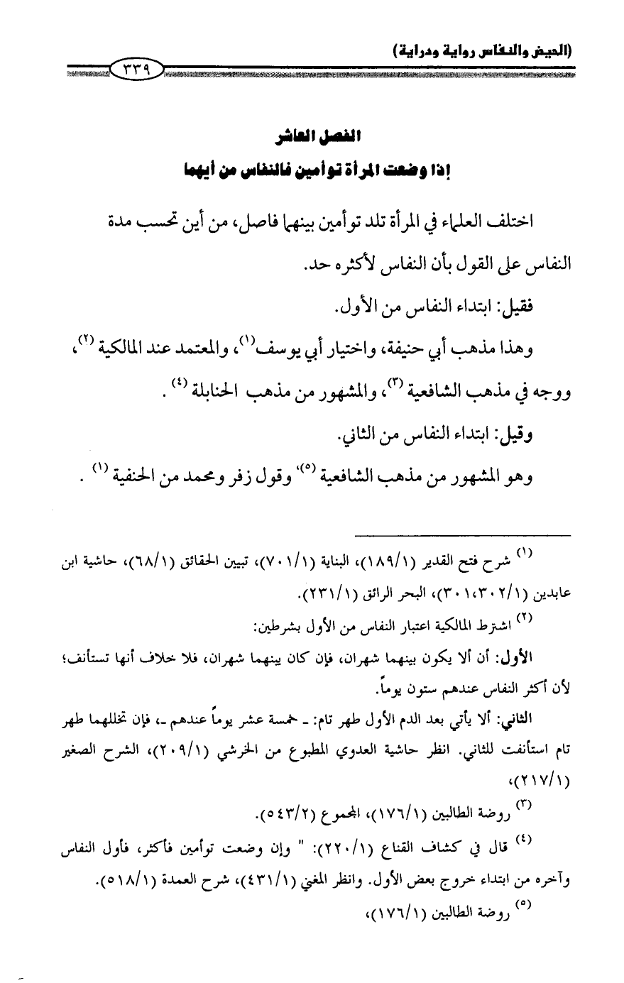 (¬4) قال في كشاف القناع (1/ 220): "وإن وضعت توأمين فأكثر، فأول النفاس وآخره من ابتداء خروج بعض الأول. وانظر المغني (1/ 431)، شرح العمدة (1/ 518).