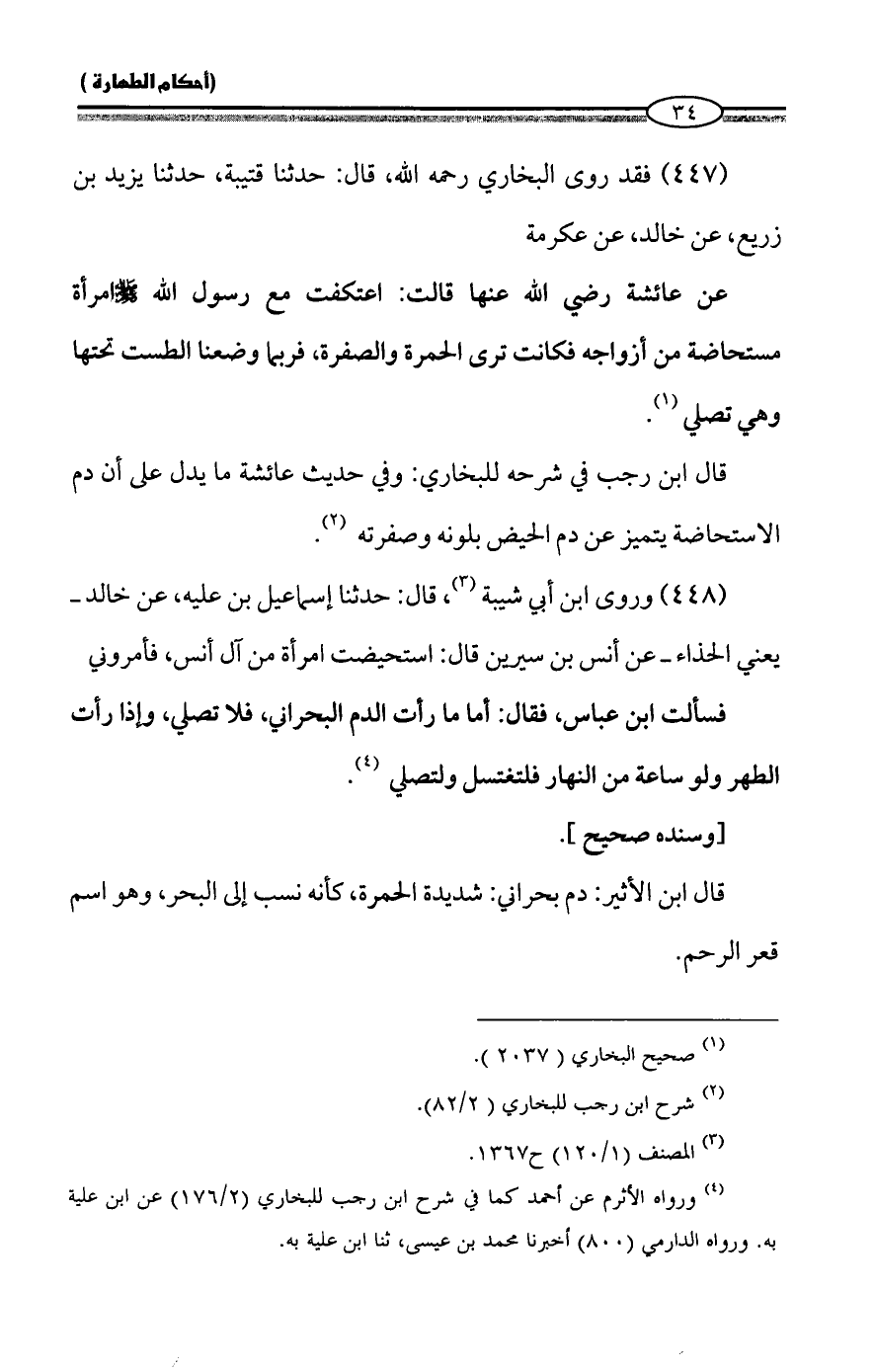 فسألت ابن عباس، فقال: أما ما رأت الدم البحراني، فلا تصلي، وإذا رأت الطهر ولو ساعة من النهار فلتغتسل ولتصلي (¬4).