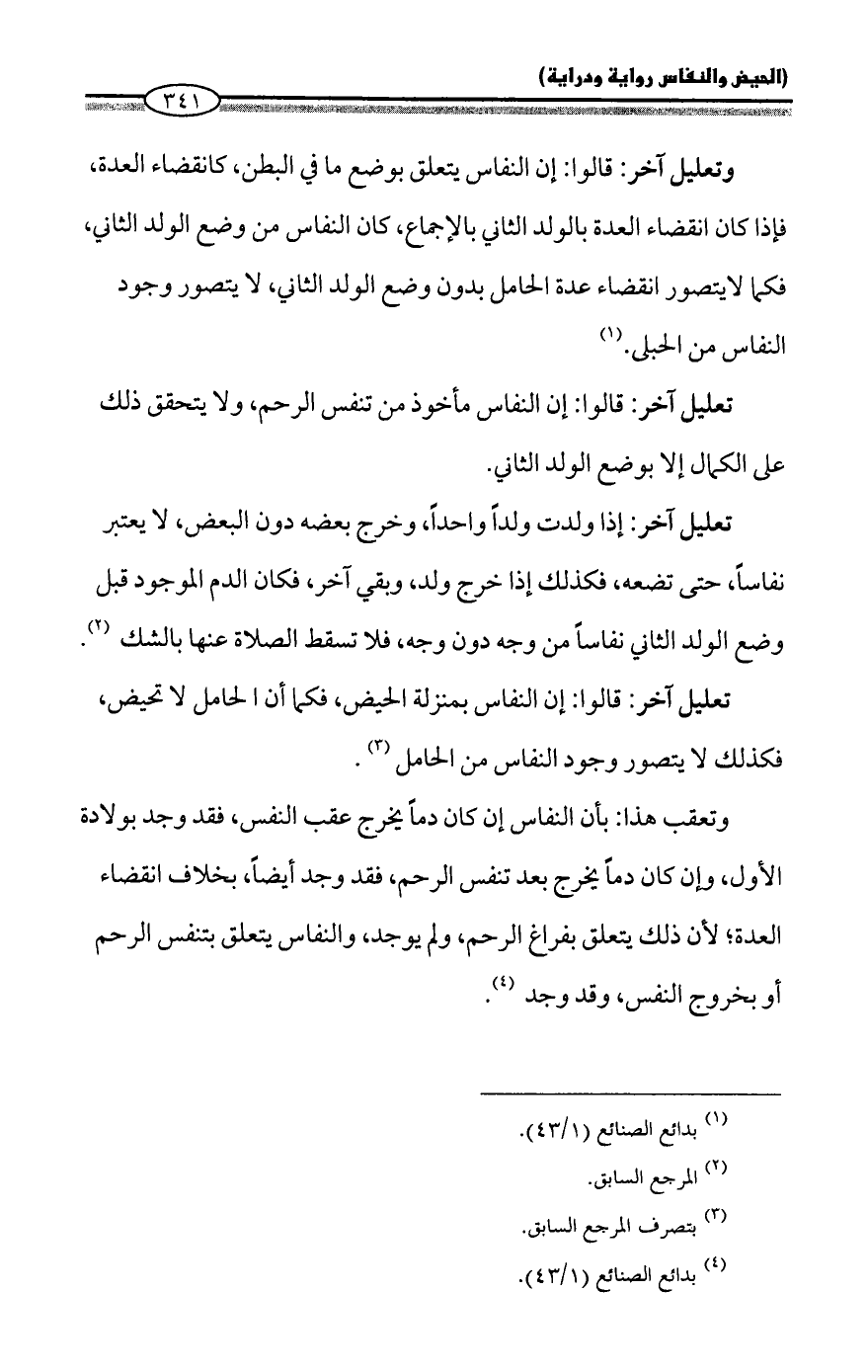 وتعليل آخر: قالوا: إن النفاس يتعلق بوضع ما في البطن، كانقضاء العدة، فإذا كان انقضاء العدة بالولد الثاني بالإجماع، كان النفاس من وضع الولد الثاني، فكما لا يتصور انقضاء عدة الحامل بدون وضع الولد الثاني، لا يتصور وجود النفاس من الحبلى. (¬1)