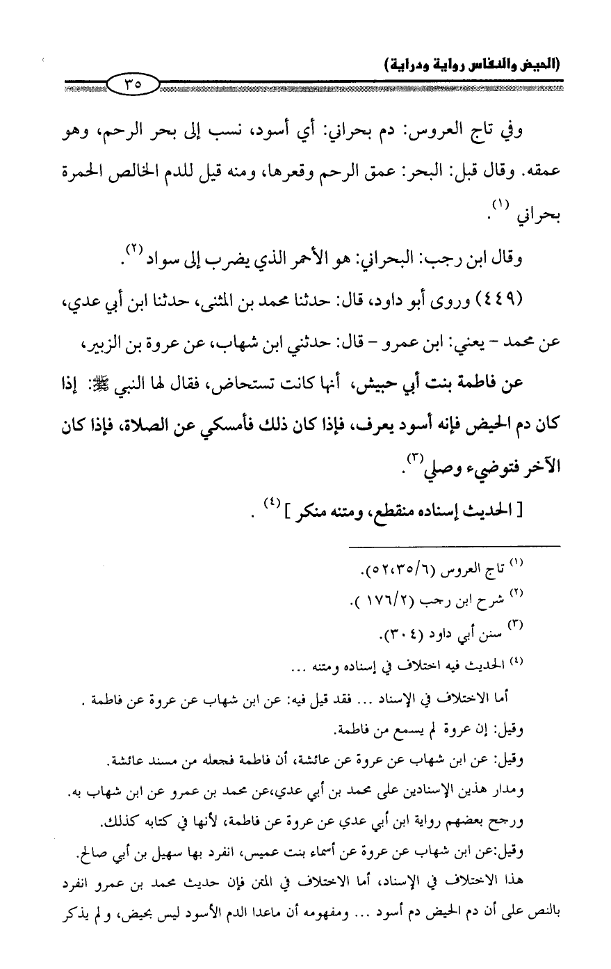 هذا الاختلاف في الإسناد، أما الاختلاف في المتن فإن حديث محمد بن عمرو انفرد على أن دم الحيض دم أسود ... ومفهومه أن ما عدا الدم الأسود ليس بحيض، ولم يذكر