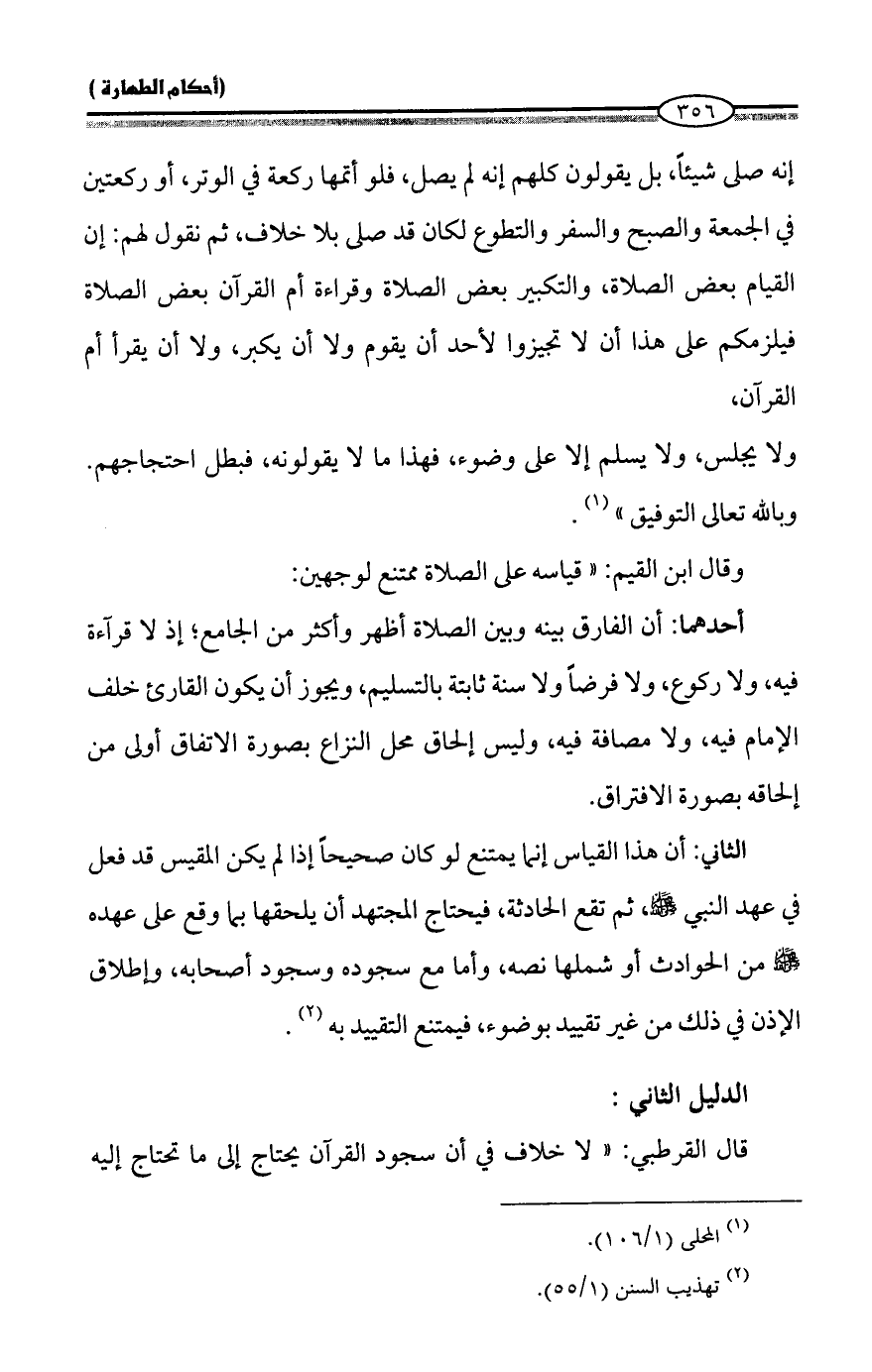 الثاني: أن هذا القياس إنما يمتنع لو كان صحيحاً إذا لم يكن المقيس قد فعل في عهد النبي - صلى الله عليه وسلم -، ثم تقع الحادثة، فيحتاج المجتهد أن يلحقها بما وقع على عهده - صلى الله عليه وسلم - من الحوادث أو شملها نصه، وأما مع سجوده وسجود أصحابه، وإطلاق الإذن في ذلك من غير تقييد بوضوء، فيمتنع التقييد به (¬2).