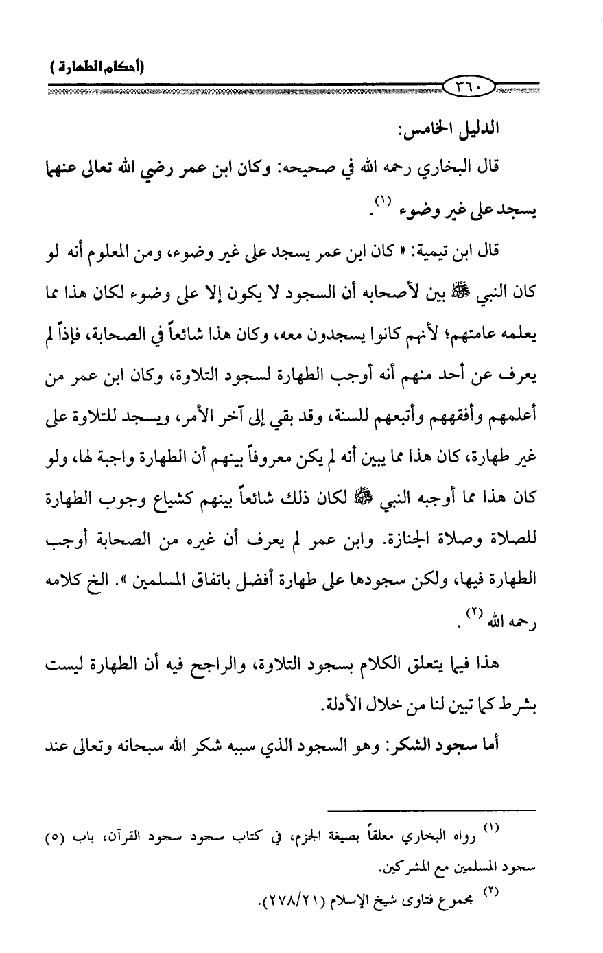 قال ابن تيمية: "كان ابن عمر يسجد على غير وضوء، ومن المعلوم أنه لو كان النبي - صلى الله عليه وسلم - بين لأصحابه أن السجود لا يكون إلا على وضوء لكان هذا مما يعلمه عامتهم؛ لأنهم كانوا يسجدون معه، وكان هذا شائعاً في الصحابة، فإذاً لم يعرف عن أحد منهم أنه أوجب الطهارة لسجود التلاوة، وكان ابن عمر من أعلمهم وأفقههم وأتبعهم للسنة، وقد بقي إلى آخر الأمر، ويسجد للتلاوة على غير طهارة، كان هذا مما يبين أنه لم يكن معروفاً بينهم أن الطهارة واجبة لها، ولو كان هذا مما أوجبه النبي - صلى الله عليه وسلم - لكان ذلك شائعاً بينهم كشياع وجوب الطهارة للصلاة وصلاة الجنازة. وابن عمر لم يعرف أن غيره من الصحابة أوجب الطهارة فيها، ولكن سجودها على طهارة أفضل باتفاق المسلمين". الخ كلامه رحمه الله (¬2).