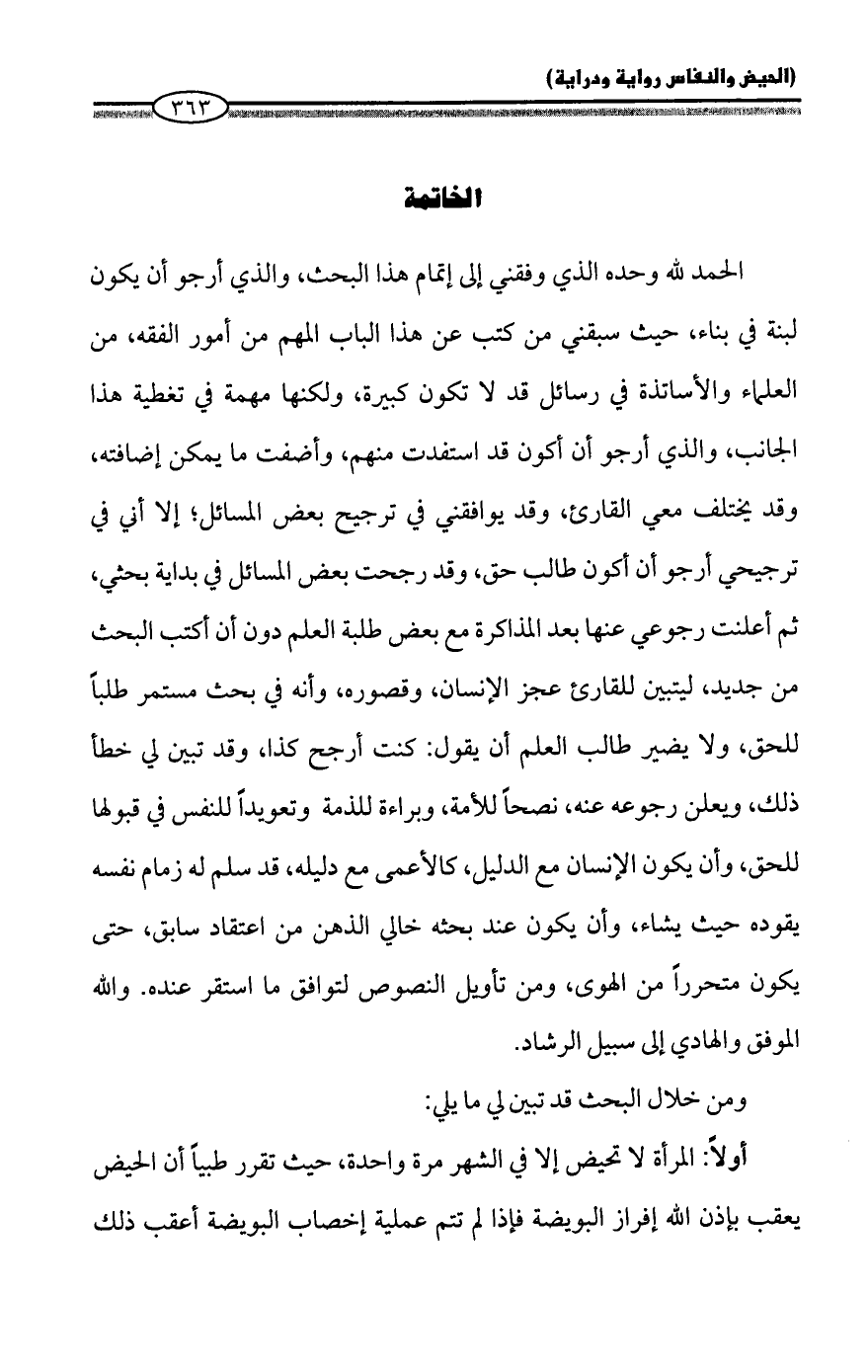 الحمد لله وحده الذي وفقني إلى إتمام هذا البحث، والذي أرجو أن يكون لبنة في بناء، حيث سبقني من كتب عن هذا الباب المهم من أمور الفقه، من العلماء والأساتذة في رسائل قد لا تكون كبيرة، ولكنها مهمة في تغطية هذا الجانب، والذي أرجو أن أكون قد استفدت منهم، وأضفت ما يمكن إضافته، وقد يختلف معي القارئ، وقد يوافقني في ترجيح بعض المسائل؛ إلا أني في ترجيحي أرجو أن أكون طالب حق، وقد رجحت بعض المسائل في بداية بحثي، ثم أعلنت رجوعي عنها بعد المذاكرة مع بعض طلبة العلم دون أن أكتب البحث من جديد، ليتبين للقارئ عجز الإنسان، وقصوره، وأنه في بحث مستمر طلباً للحق، ولا يضير طالب العلم أن يقول: كنت أرجح كذا، وقد تبين لي خطأ ذلك، ويعلن رجوعه عنه، نصحاً للأمة، وبراءة للذمة وتعويداً للنفس في قبولها للحق، وأن يكون الإنسان مع الدليل، كالأعمى مع دليله، قد سلم له زمام نفسه يقوده حيث يشاء، وأن يكون عند بحثه خالي الذهن من اعتقاد سابق، حتى يكون متحرراً من الهوى، ومن تأويل النصوص لتوافق ما استقر عنده. والله الموفق والهادي إلى سبيل الرشاد.