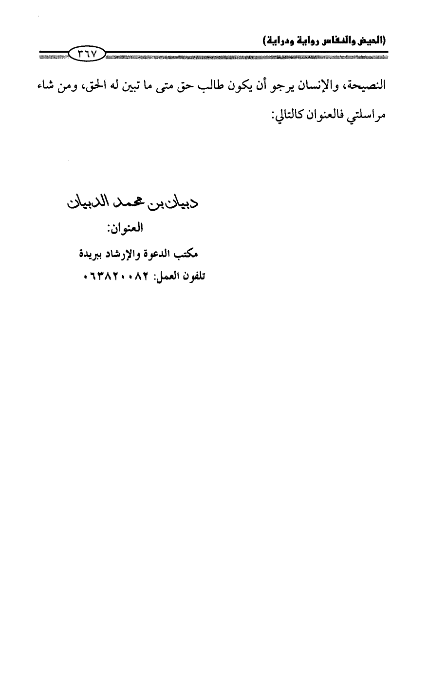 النصيحة، والإنسان يرجو أن يكون طالب حق متى ما تبين له الحق، ومن شاء مراسلتي فالعنوان كالتالي: