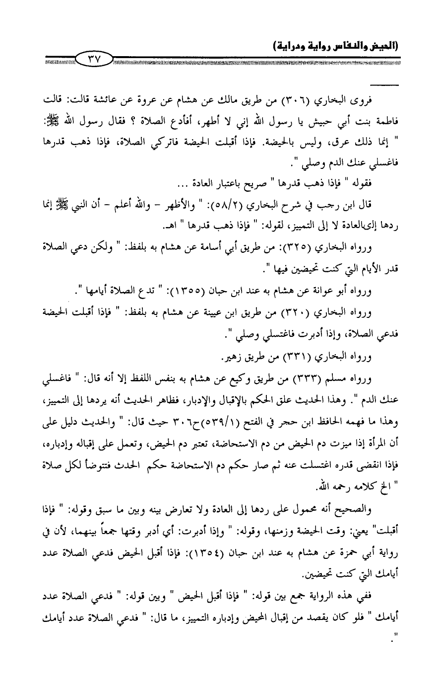 ورواه مسلم (333) من طريق وكيع عن هشام به بنفس اللفظ إلا أنه قال: "فاغسلي عنك الدم". وهذا الحديث علق الحكم بالإقبال والإدبار، فظاهر الحديث أنه يردها إلى التمييز، وهذا ما فهمه الحافظ ابن حجر في الفتح (1/ 539) ح 306 حيث قال: "والحديث دليل على أن المرأة إذا ميزت دم الحيض من دم الاستحاضة، تعتبر دم الحيض، وتعمل على إقباله وإدباره، فإذا انقضى قدره اغتسلت عنه ثم صار حكم دم الاستحاضة حكم الحدث فتتوضأ لكل صلاة" الخ كلامه رحمه الله.