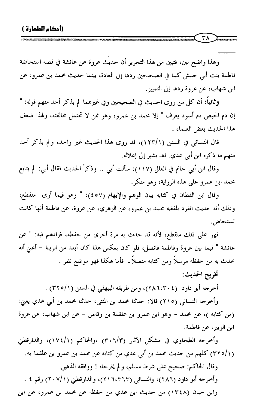وهذا واضح بين، فتبين من هذا التحرير أن حديث عروة عن عائشة في قصه استحاضة فاطمة بنت أبي حبيش كما في الصحيحين ردها إلى العادة، بينما حديث محمد بن عمرو، عن ابن شهاب، عن عروة ردها إلى التمييز.