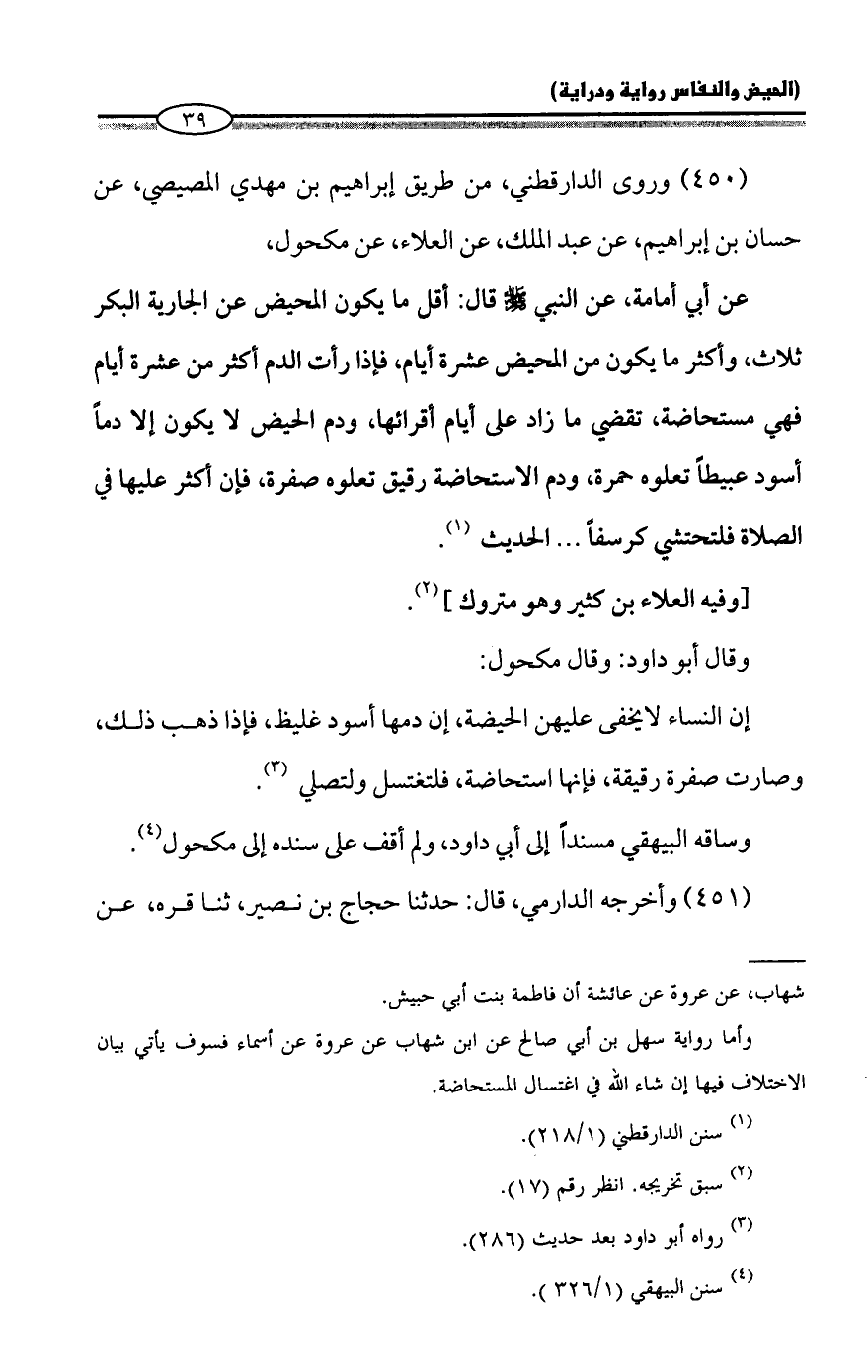 (450) وروى الدارقطني، من طريق إبراهيم بن مهدي المصيصي، عن حسان بن إبراهيم، عن عبد الملك، عن العلاء، عن مكحول،