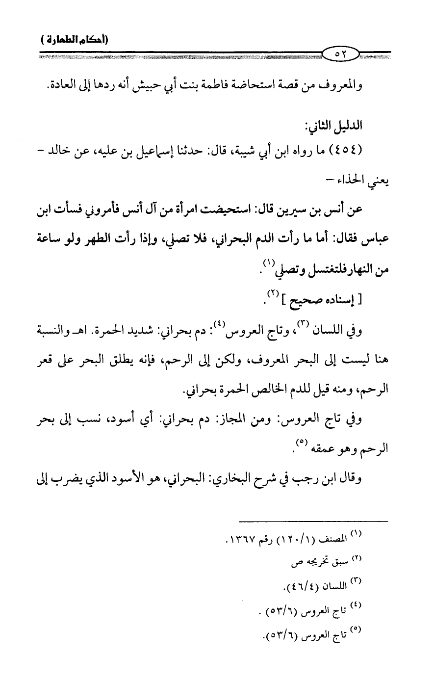 عن أنس بن سيرين قال: استحيضت امرأة من آل أنس فأمروني فسألت ابن عباس فقال: أما ما رأت الدم البحراني، فلا تصلي، وإذا رأت الطهر ولو ساعة من النهار فلتغتسل وتصلي (¬1).