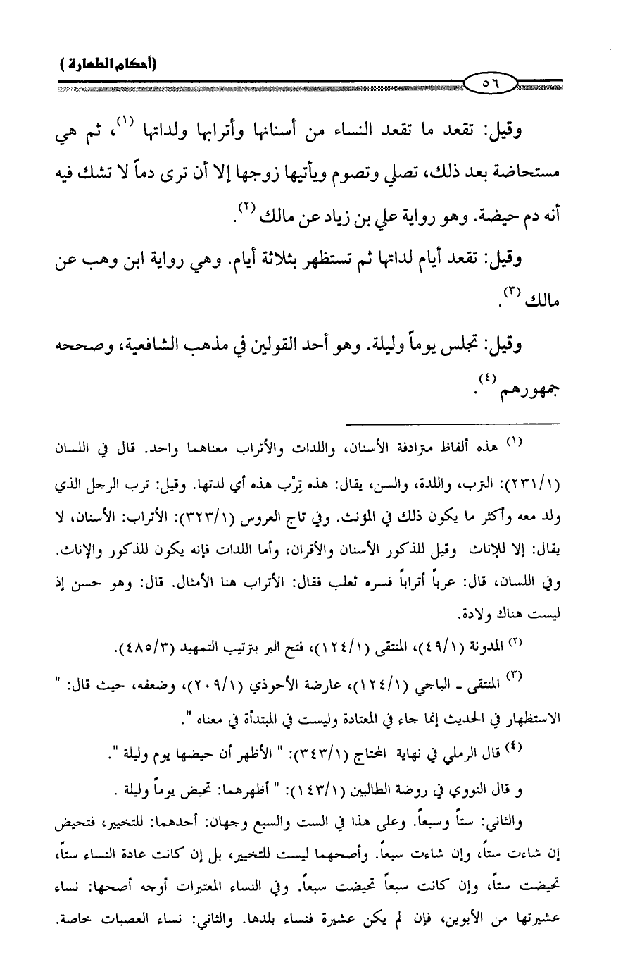 وقيل: تقعد ما تقعد النساء من أسنانها وأترابها ولداتها (¬1)، ثم هي مستحاضة بعد ذلك، تصلي وتصوم ويأتيها زوجها إلا أن ترى دماً لا تشك فيه أنه دم حيضة. وهو رواية علي بن زياد عن مالك (¬2).