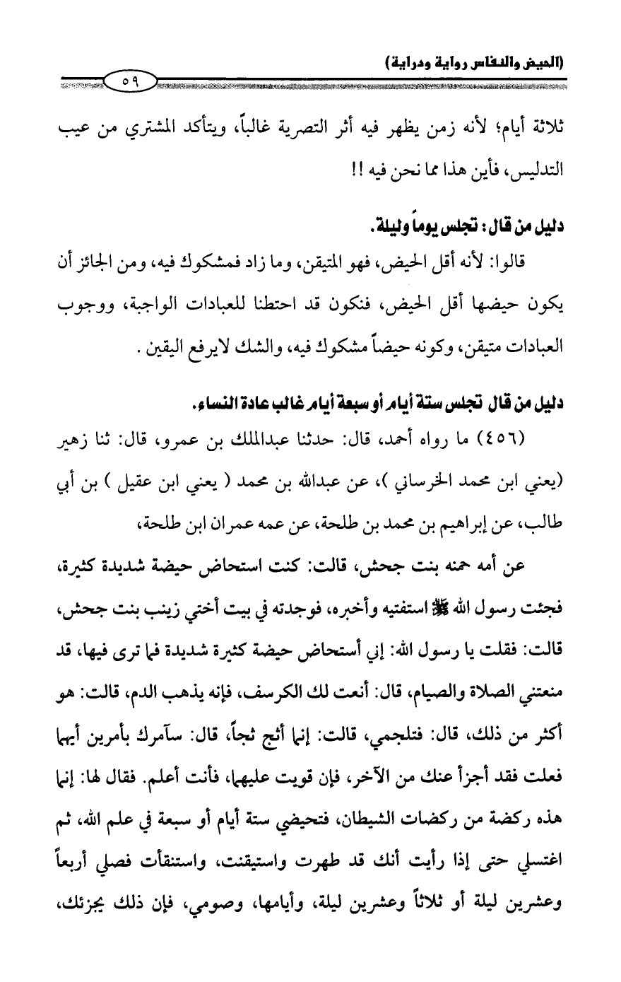 عن أمه حمنه بنت جحش، قالت: كنت استحاض حيضة شديدة كثيرة، فجئت رسول الله - صلى الله عليه وسلم - استفتيه وأخبره، فوجدته في بيت أختي زينب بنت جحش، قالت: فقلت يا رسول الله: إني أستحاض حيضة كثيرة شديدة فما ترى فيها، قد منعتني الصلاة والصيام، قال: أنعت لك الكرسف، فإنه يذهب الدم، قالت: هو أكثر من ذلك، قال: فتلجمي، قالت: إنما أثج ثجاً، قال: سآمرك بأمرين أيهما فعلت فقد أجزأ عنك من الآخر، فإن قويت عليهما، فأنت أعلم. فقال لها: إنما هذه ركضة من ركضات الشيطان، فتحيضي ستة أيام أو سبعة في علم الله، ثم اغتسلي حتى إذا رأيت أنك قد طهرت واستيقنت، واستنقأت فصلي أربعاً وعشرين ليلة أو ثلاثاً وعشرين ليلة، وأيامها، وصومي، فإن ذلك يجزئك،