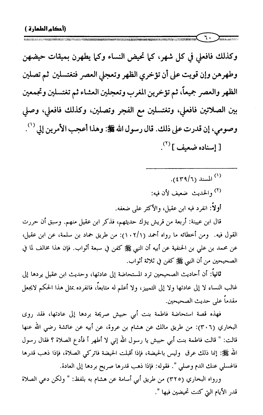 ثانياً: أن أحاديث الصحيحين ترد المستحاضة إلى عادتها، وحديث ابن عقيل يردها إلى غالب النساء لا إلى عادتها ولا إلى التمييز، ولا أعلم له متابعاً، فانفرده بمثل هذا الحكم لا يجعل مقدماً على حديث الصحيحين.