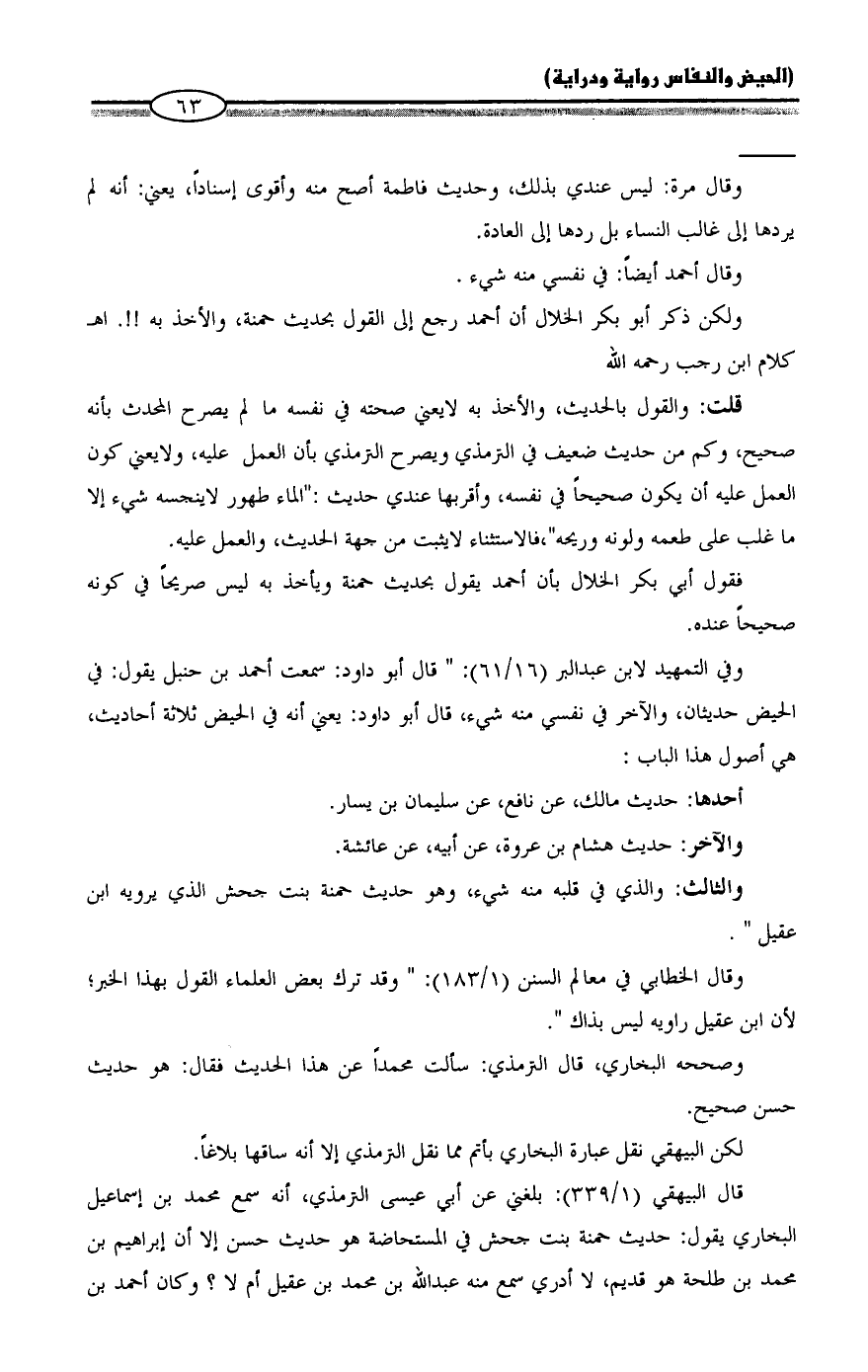 وفي التمهيد لابن عبد البر (16/ 16): "قال أبو داود: سمعت أحمد بن حنبل يقول: في الحيض حديثان، والآخر في نفسي منه شيء، قال أبو داود: يعني أنه في الحيض ثلاثة أحاديث، هى أصول هذا الباب: